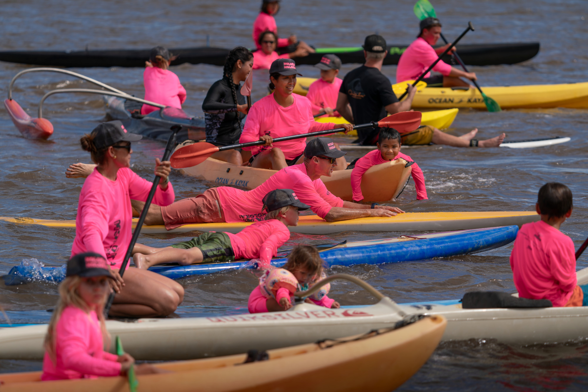 The first wave of competitors, wearing bright pink race jerseys, arrived at Molokai’s Kaunakakai Wharf around 12:30 p.m., and by 3 p.m. mostly everyone had arrived. The competitors were greeted with leis, fruit bowls and beverages. At 3 p.m., everyone was invited to a pā‘ina the Molokai Community Health Center in Kaunakakai, where they ate dinner and enjoyed live Hawaiian music by Justin Mamuad and Bryson Santiago. The awards were distributed at 6 p.m.