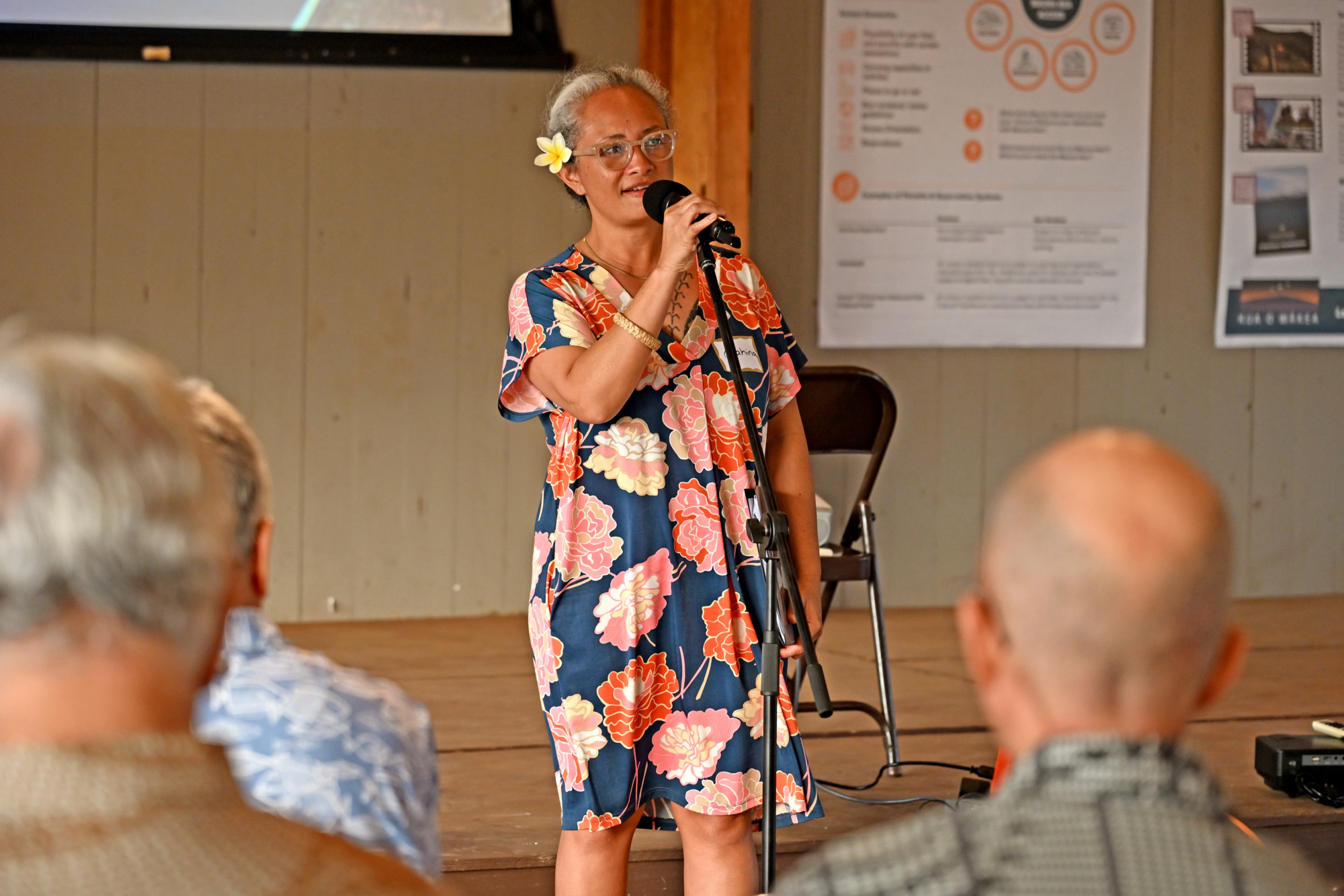 Facilitator Mahina Paishon is seen here at the Mauna Kea Stewardship and Oversight Authority meeting last week. Photo by Léo Azambuja