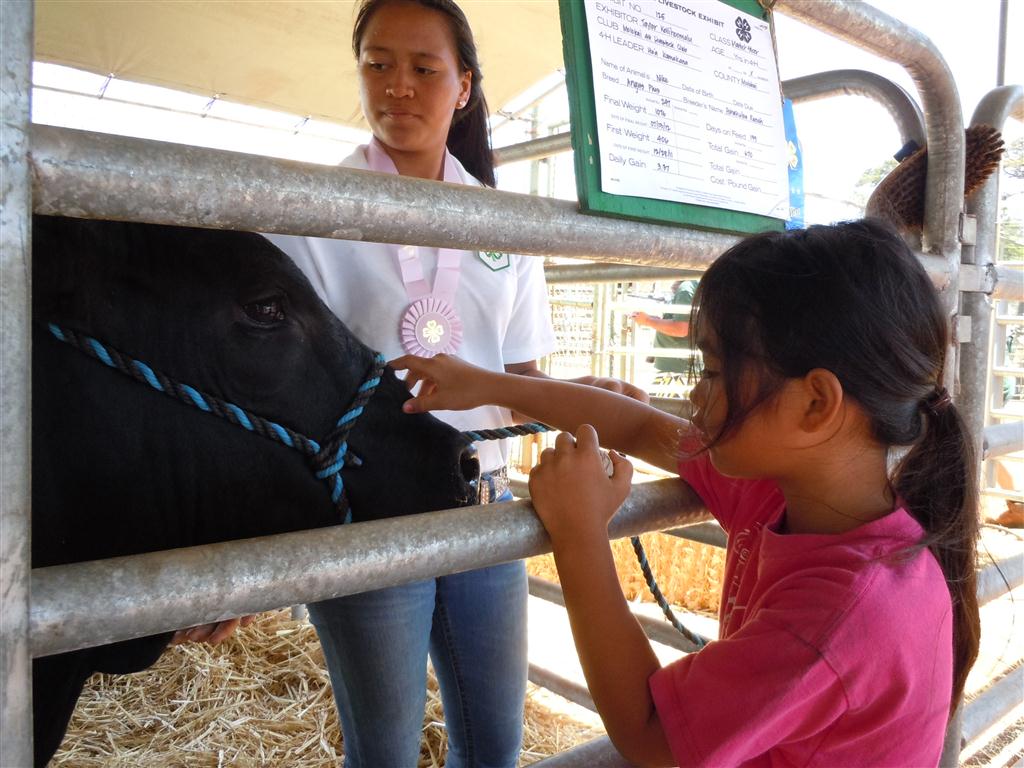 Second place market showmanship senior winner Taylor Keliihoomalu shares her steer with a young enthusiast. Photo by Catherine Cluett.