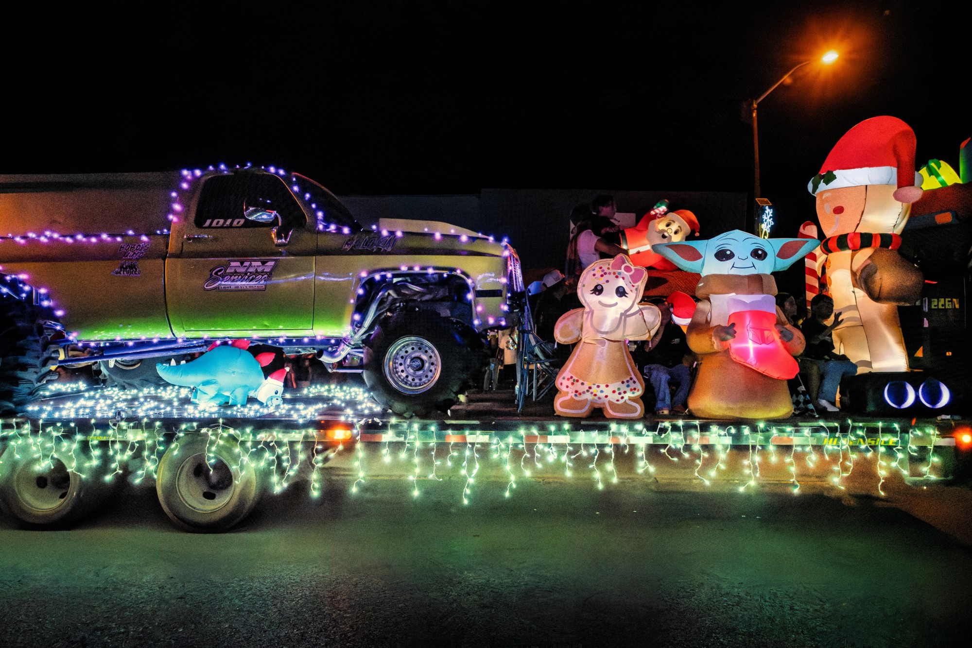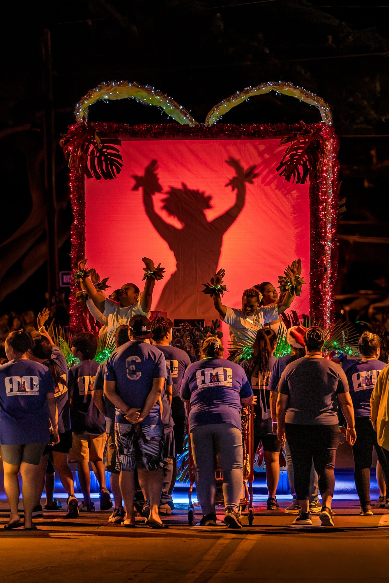 The parade — along with the Hoʻolauleʻa and the Bed Race — was one of three main events happening in Kaunakakai on the evening of Dec. 6. The parade started as soon as it got dark, just after 6 p.m. For about 40 minutes, several large floats, along with smaller floats, motorcycles and even a long line of mud boggers paraded through town.