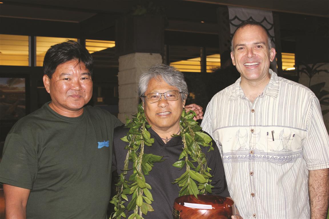 Rob Stevenson (right), Molokai Chamber of Comerce, gifted award recipient Puleloa (center) a check of $250, which he donated to The Nature Conservancy, headed by Ed Misaki (left).
