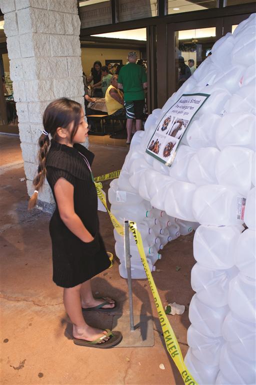 Molokai keiki Lilia Tangonan, 7, checks out a plastic gallon igloo sculpture made by Kualapu`u School Pre-Kindergarten.