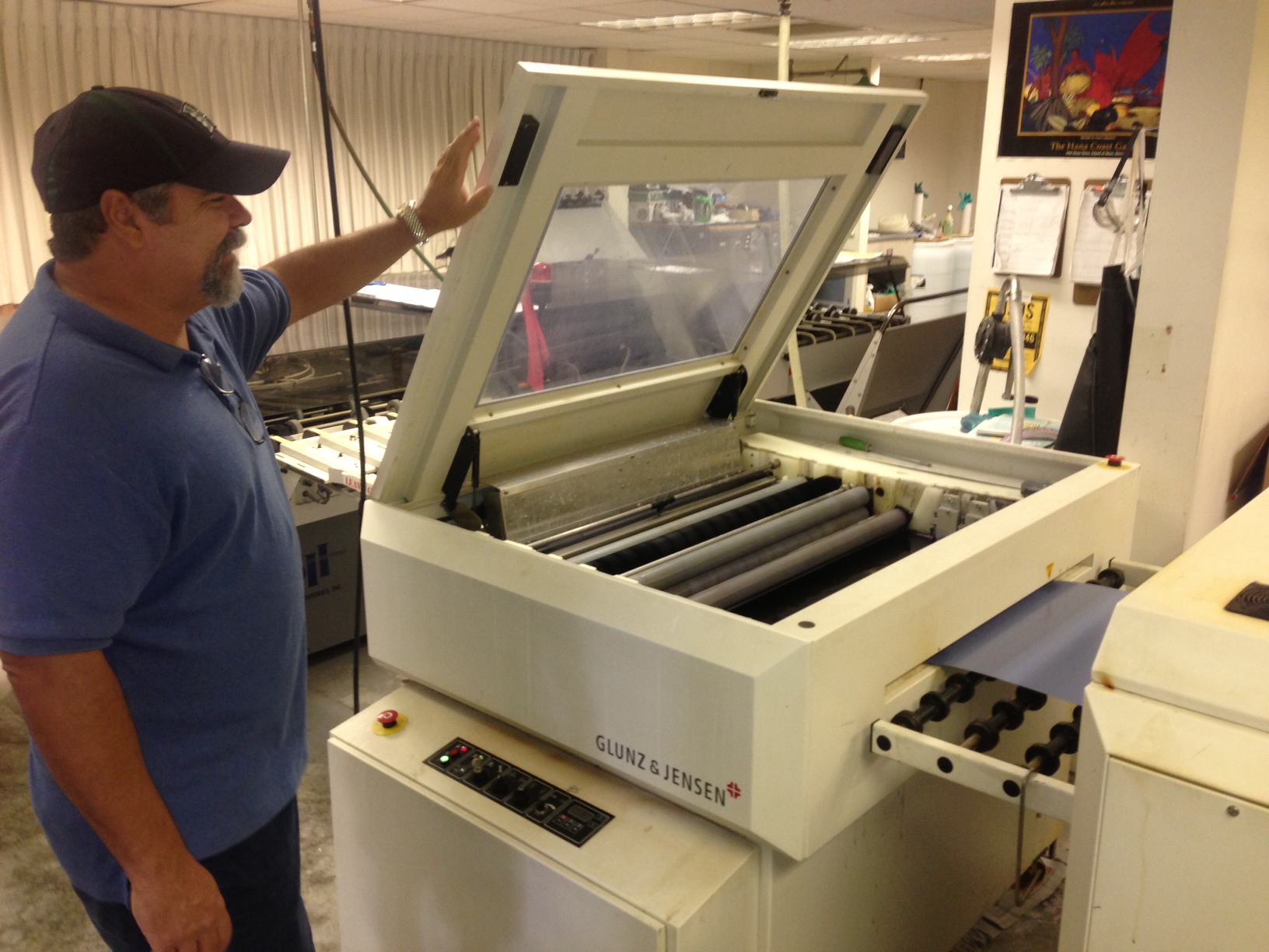 From multiple computers, Ferreira is able check resolution, correct color profiles and much more. Once the Dispatch is prepped and ready, he sends the document to a machine that places the image on a polymer coated metal plate.