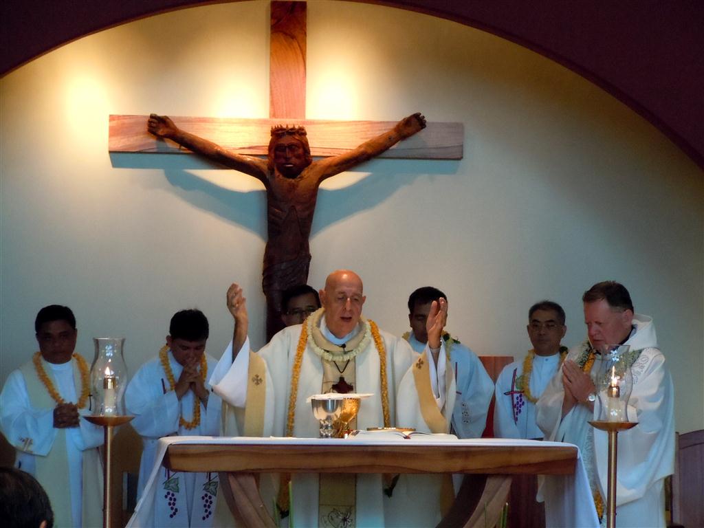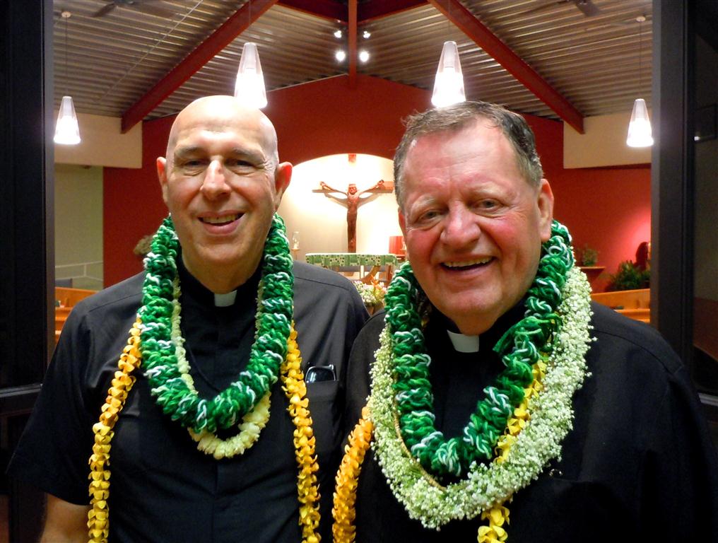 Bishop Larry Silva and Father William Petrie (right) at his installation at St. Damien Church. Photo by Catherine Cluett