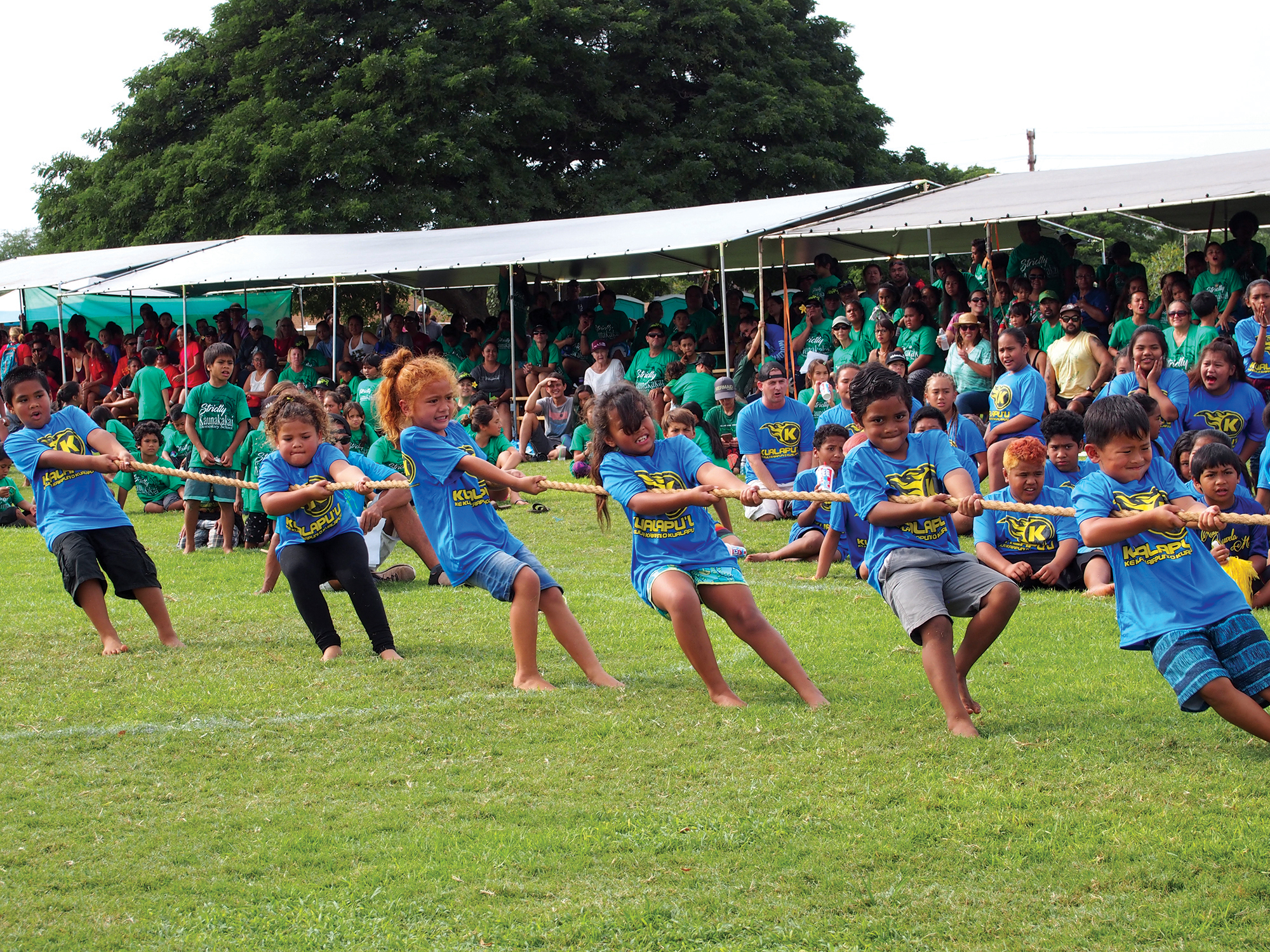 Students train for months and are selected from their schools to compete in events like kukini, or running races (pictured), hukihuki, or tug of war (pictured), uma or arm wrestling and konane, or Hawaiian checkers, to name a few. After each event, the winner honored the island’s kupuna, who watched the games from head of the field (pictured).