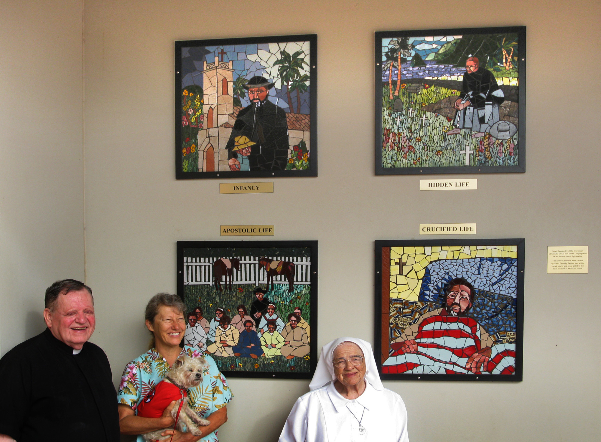 In 2011, Saint Damien Parish former pastor Father Clyde Guerrero was in the homestretch of supervising the construction of the long awaited Saint Damien of Molokai Church. Aware of her work in making beautiful mosaics of Father Damien and other holy persons, Father Clyde asked Sister Dorothy if she would create the mosaics. In February 2015, 93-year-old Sister Dorothy and her mosaic mentor and collaborator, Honolulu artist Karen Lucas, traveled to Molokai to see the installation and to receive the personal thanks of Father William F. Petrie, the current Pastor of the Saint Damien of Molokai Parish. The mosaics are a gift of the Hawaii Sisters of the Sacred Hearts of Jesus and Mary to the Saint Damien Parish. On a daily basis, parishioners and pilgrims to Molokai now delight in their presence.