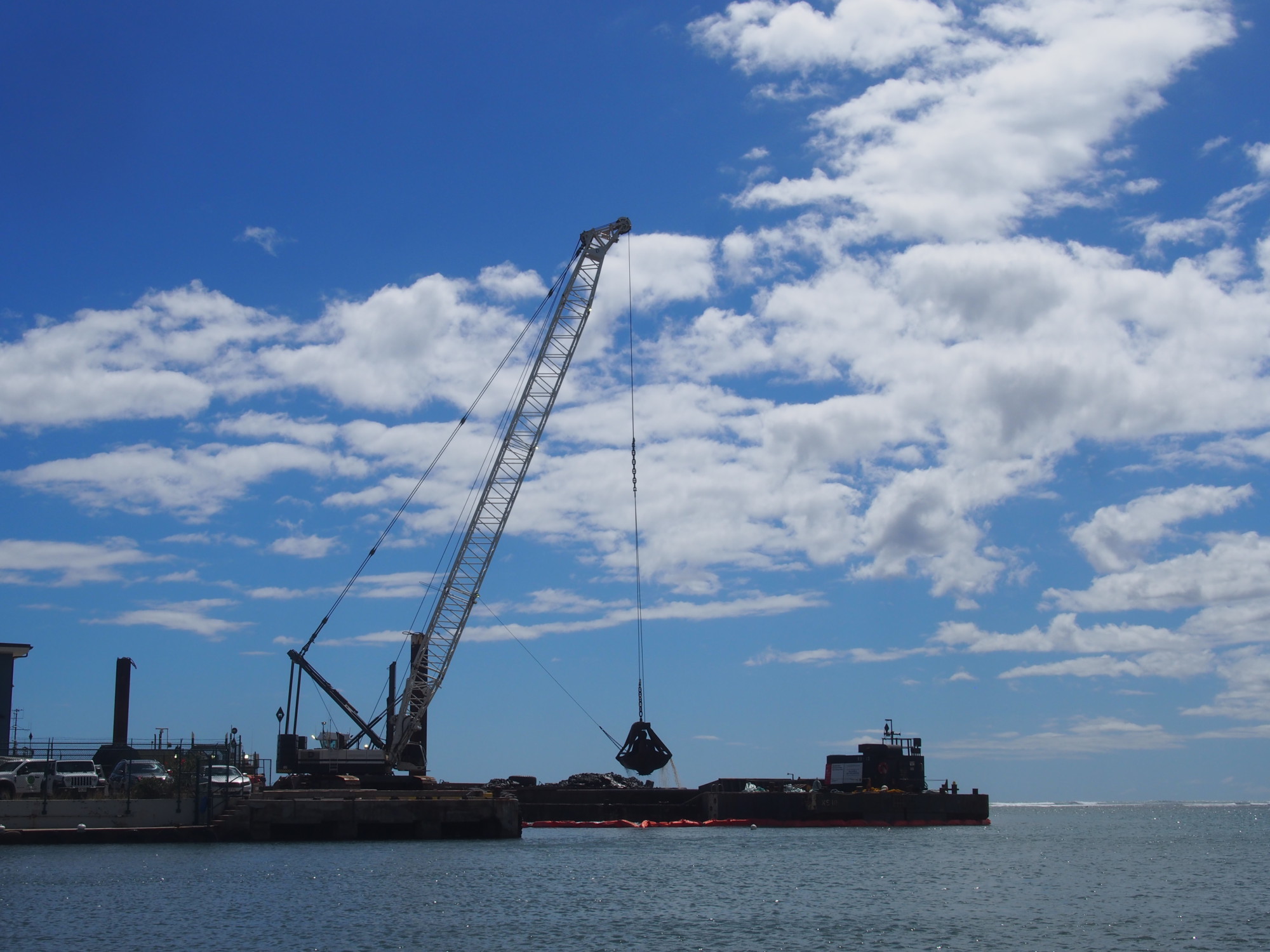 Dredging is underway to remove a build-up of silt and restore the Kaunakakai Harbor to its previous depth of 23 feet so the barge can continue to use the wharf. A crane uses a clamshell bucket to grab 30,000 cubic yards of inky sediment from the bottom of the harbor, deposit the silt into a dump scow barge, and drop it 40 miles away at a dumpsite off-shore from Kahului. The dredging should be completed around May 6.
