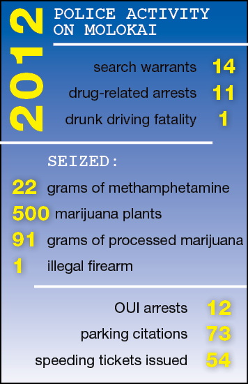 Police also addressed speeding, parking and jay walking complaints. In 2012, 73 parking citations, particularly in cul-de-sacs and no-parking zones, and 54 speeding tickets were issued. A discussion of jay-walking violations was met with chuckles from community members, who recalled a crack-down on jay-walking in Kaunakakai last year. Police said local complaints had been received, and as a result, warnings, followed by citations, were issued to those not using crosswalks in town.