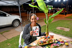 Leimana Ritte-Camara taught a colorful workshop on printing with cut-up banana stalks, which was popular with kids. Kaulananapua Dudoit taught how to make roses using the dry outer layer of the banana stalk.