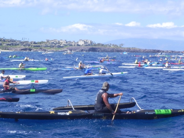 Over 250 paddlers from all across the world came out for this year’s Maui-to-Molokai (M2M) race. First place finisher and Molokai native Carlton Helm (#88) paddles alongside other competitors across the Pailolo Channel. Photo Courtesy Stacie Thorlakson