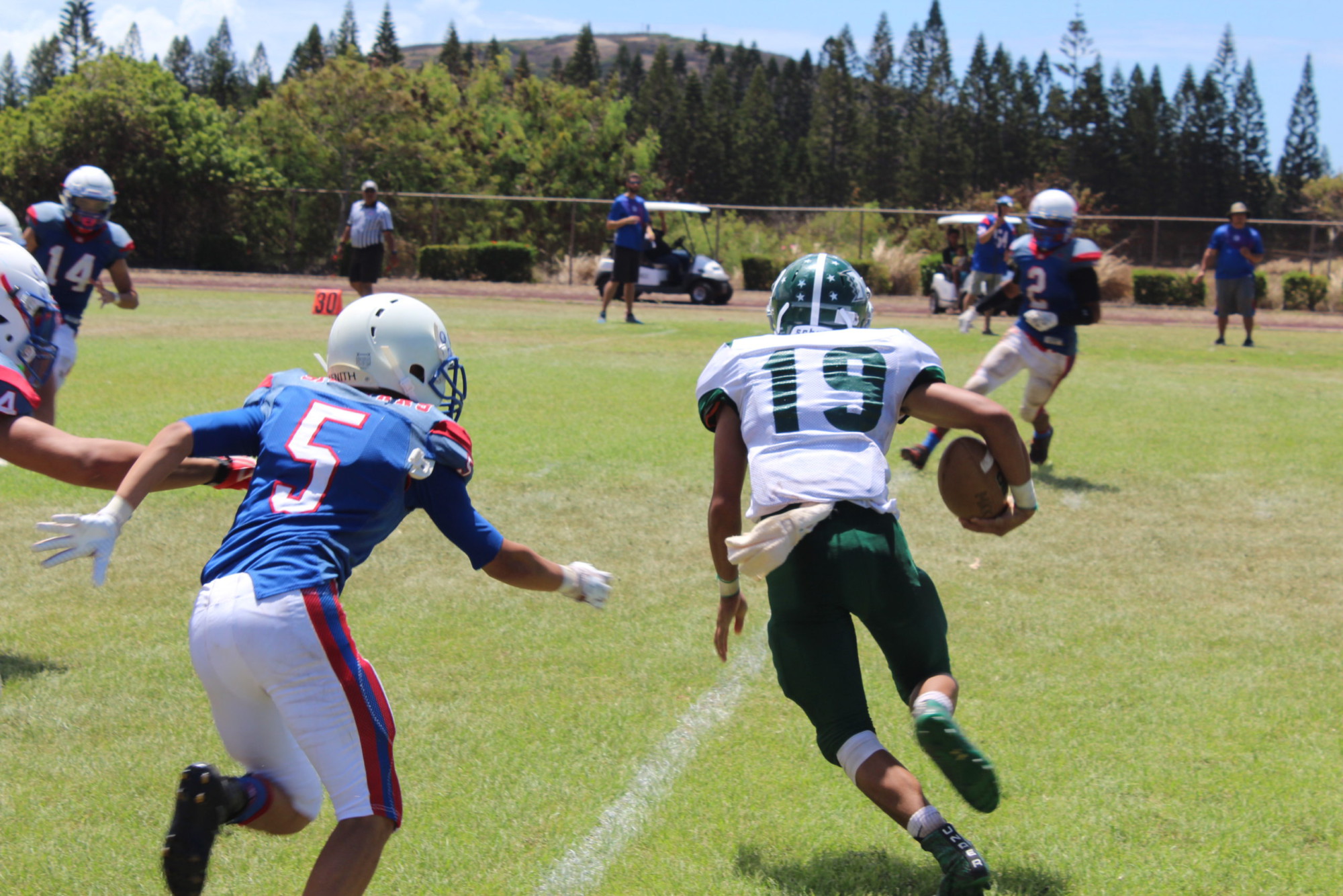 The Molokai Farmers Football team started their regular season and their quest for a Maui Interscholastic League Championship three-peat with a 35-26 win over rival Seabury Hall last Saturday at the MHS field. It was the first game with a newly installed football scoreboard, and large crowd was on hand to support the Farmers. Molokai was led by senior quarterback Shraedon Naeole-Starkey who threw three touchdown passes and ran for another touchdown. Sophomore Kaimana Nakayama caught two touchdown passes and was also successful on all five extra points. Senior Braiden Asuncion and Junior Jayse Lalim-Rillon had touchdown runs also, while junior Chevy Augustiro led the defense in tackles and recovered two fumbles.