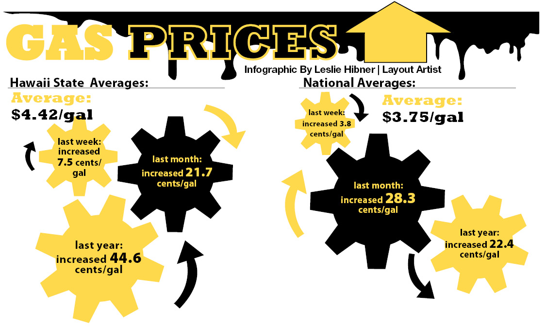 The national average has increased 28.3 cents per gallon during the last month and stands 22.4 cents per gallon higher than this day one year ago, according to GasBuddy.com. In Hawaii, the average price of gas has increased 21.7 cents per gallon in the last month and stands 44.6 cents per gallon higher than the same day one year ago.