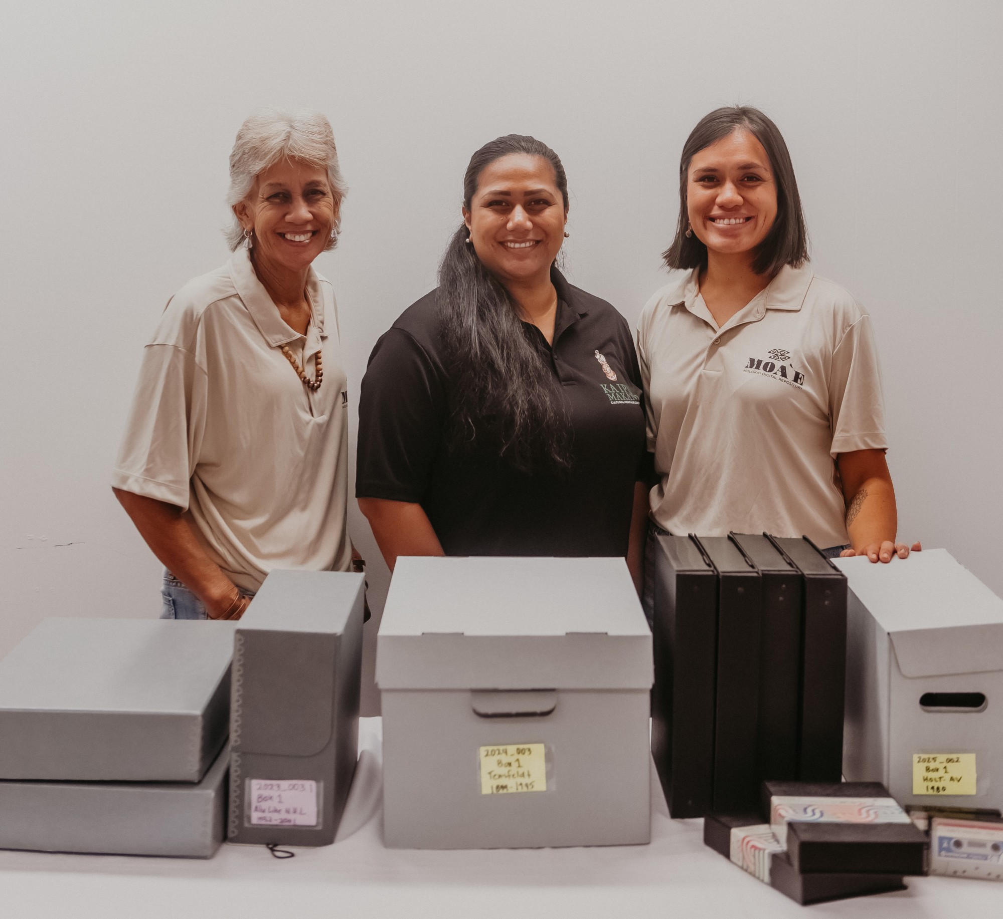 Left to right, Moa’e intern Jonnette Spencer, Ka Ipu Makani executive director Pulama Lima, and Moa’e lead archivist Melia Kalawe. Contributed photo