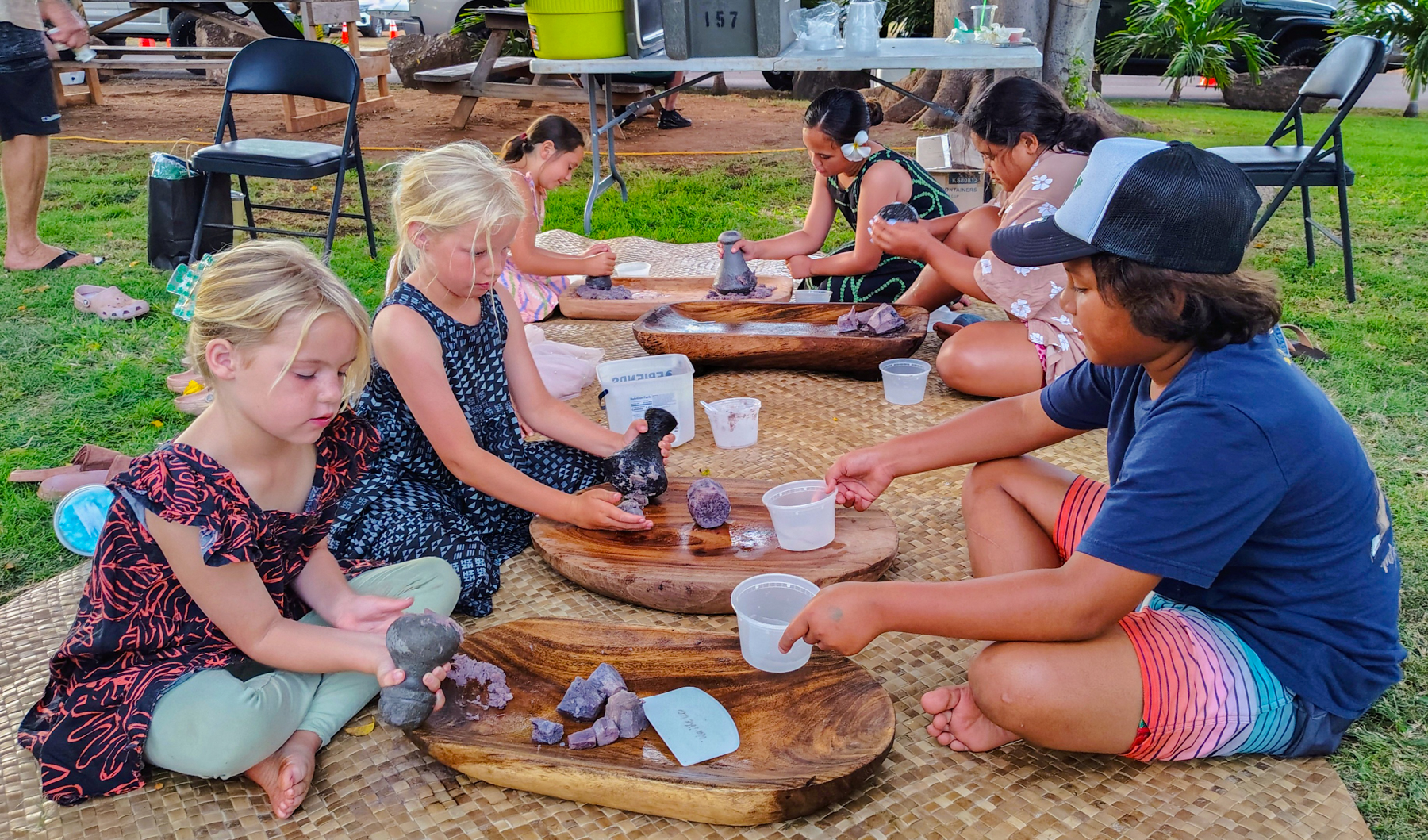 On a grassy, shady area, children learned how to pound kalo and make poi. The free activity was supervised by Malia Waits, who along with her husband Jaya, own and operate a kalo farm called Ahupua‘a ‘o Halawa in Halawa Valley.