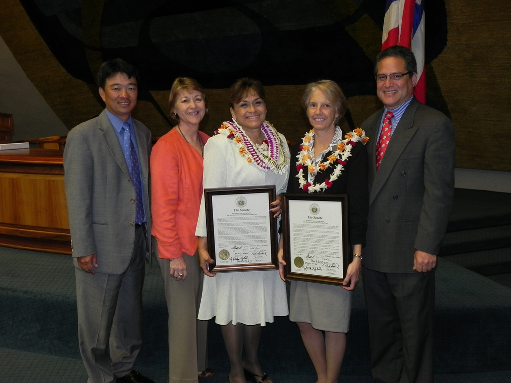 Maui Senators congratulate members of the Maui Invasive Species Committee. Left to right, Sen. Shan Tsutsui, Sen. Roz Baker, Lori Buchanan, Teya Penniman, and Sen. J. Kalani English.