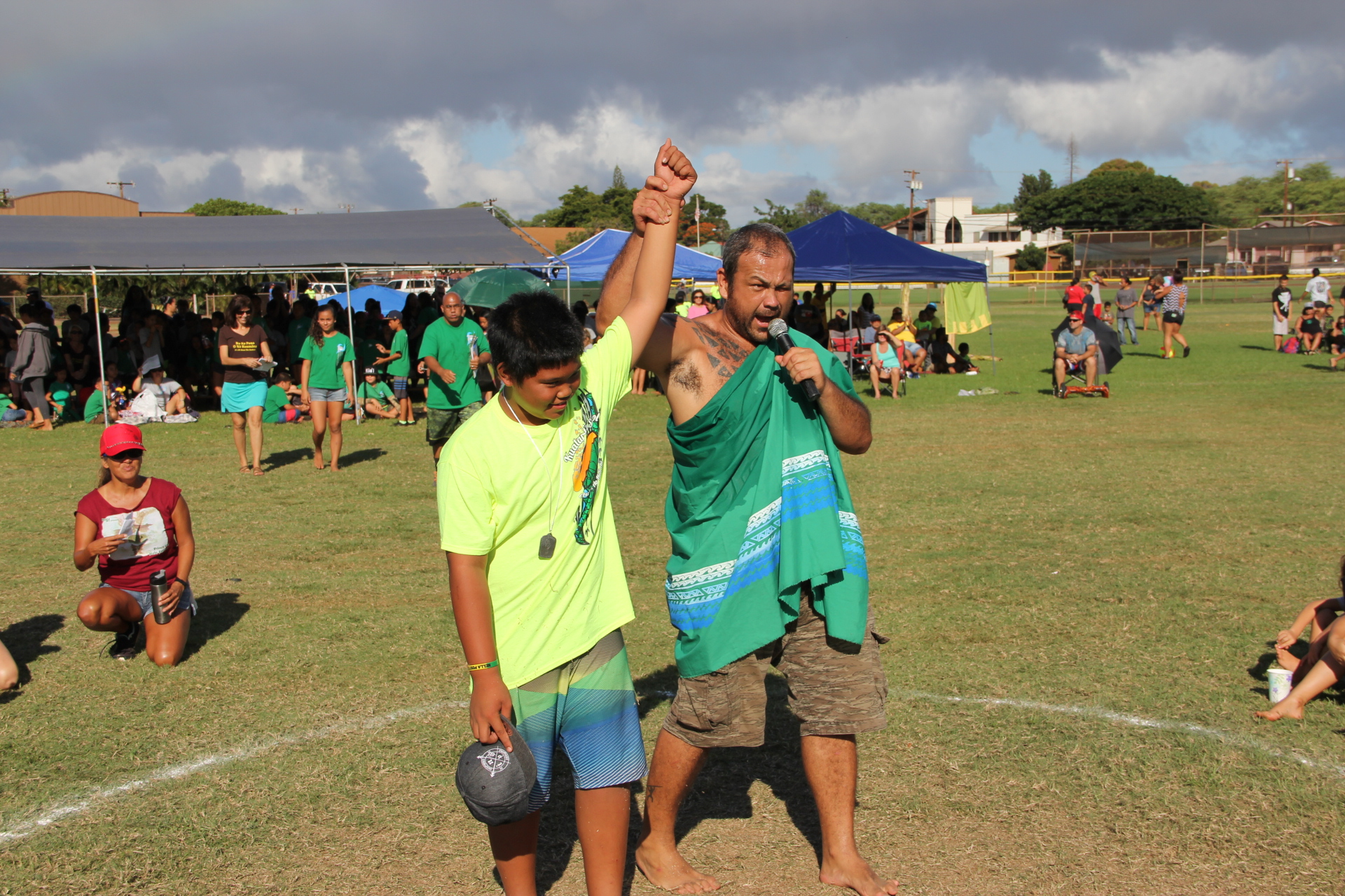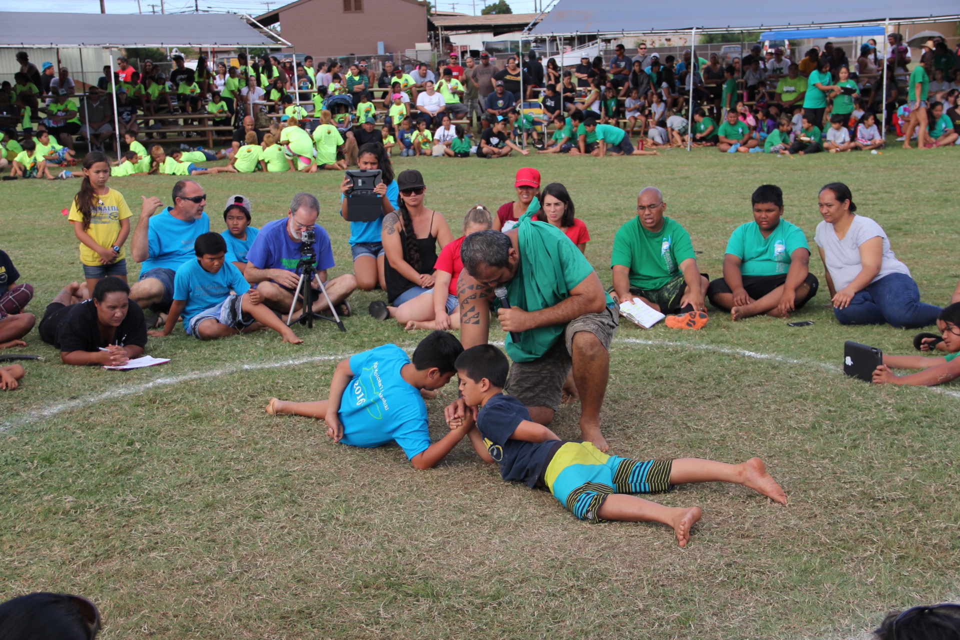 Students train at school for months and are selected from their classes to represent at the games. They each hope to win for their district in feats of athleticism such as hukihuki (tug of war), haka noa (chicken fight while jumping on one leg), ulu maika (similar to bowling), `o`oihe (spear throwing), kukini (running races) and uma (arm wrestling). Pictured above, students grapple in uma, and Hokuao Arce is named the fifth grade uma champion.