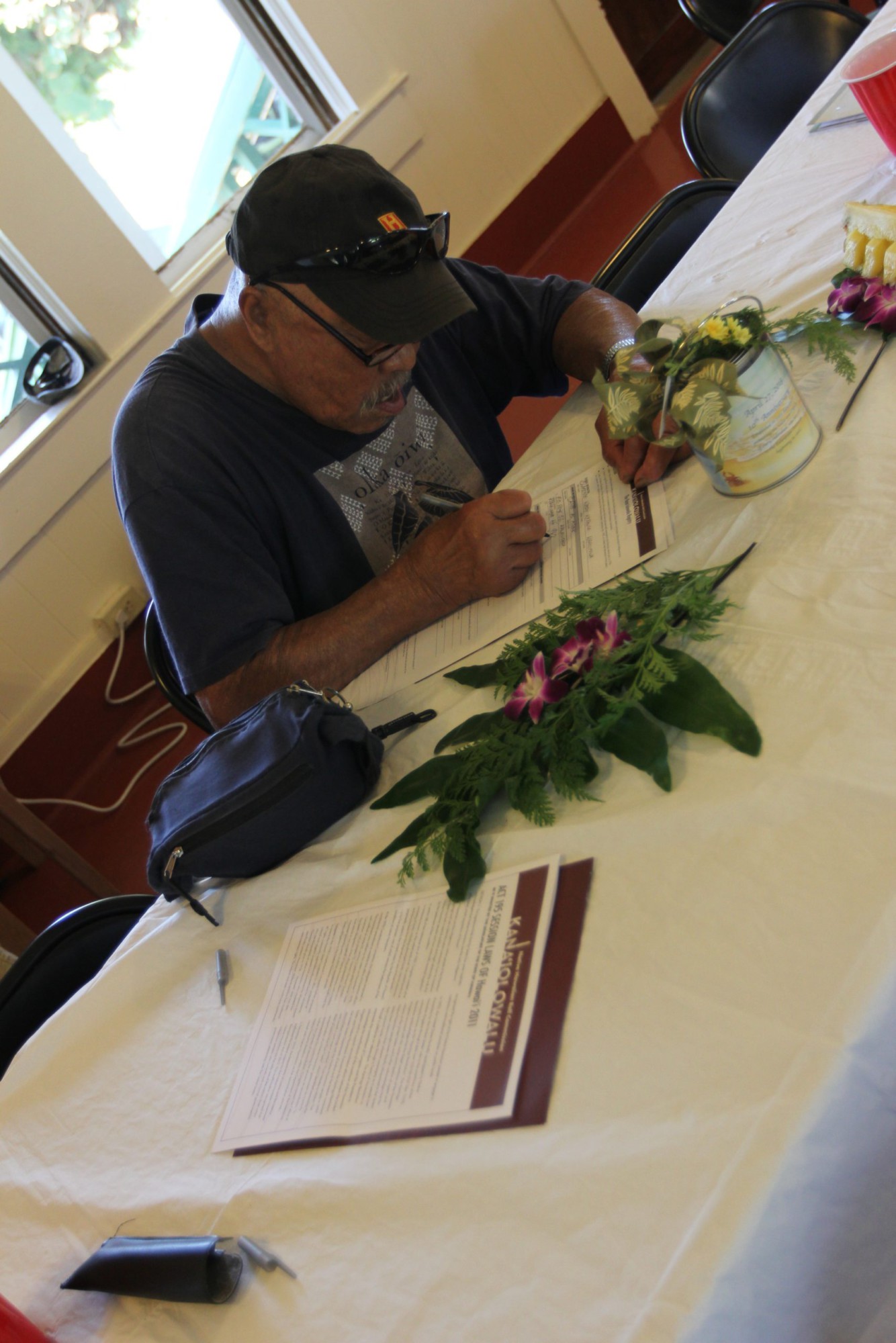 Clarence “Boogie” Kahilihiwa signs the Kana`iolowalu petition at McVeigh Hall at Kalaupapa during the annual meeting of Ka ‘Ohana O Kalaupapa. Photo by Na`alehu Anthony