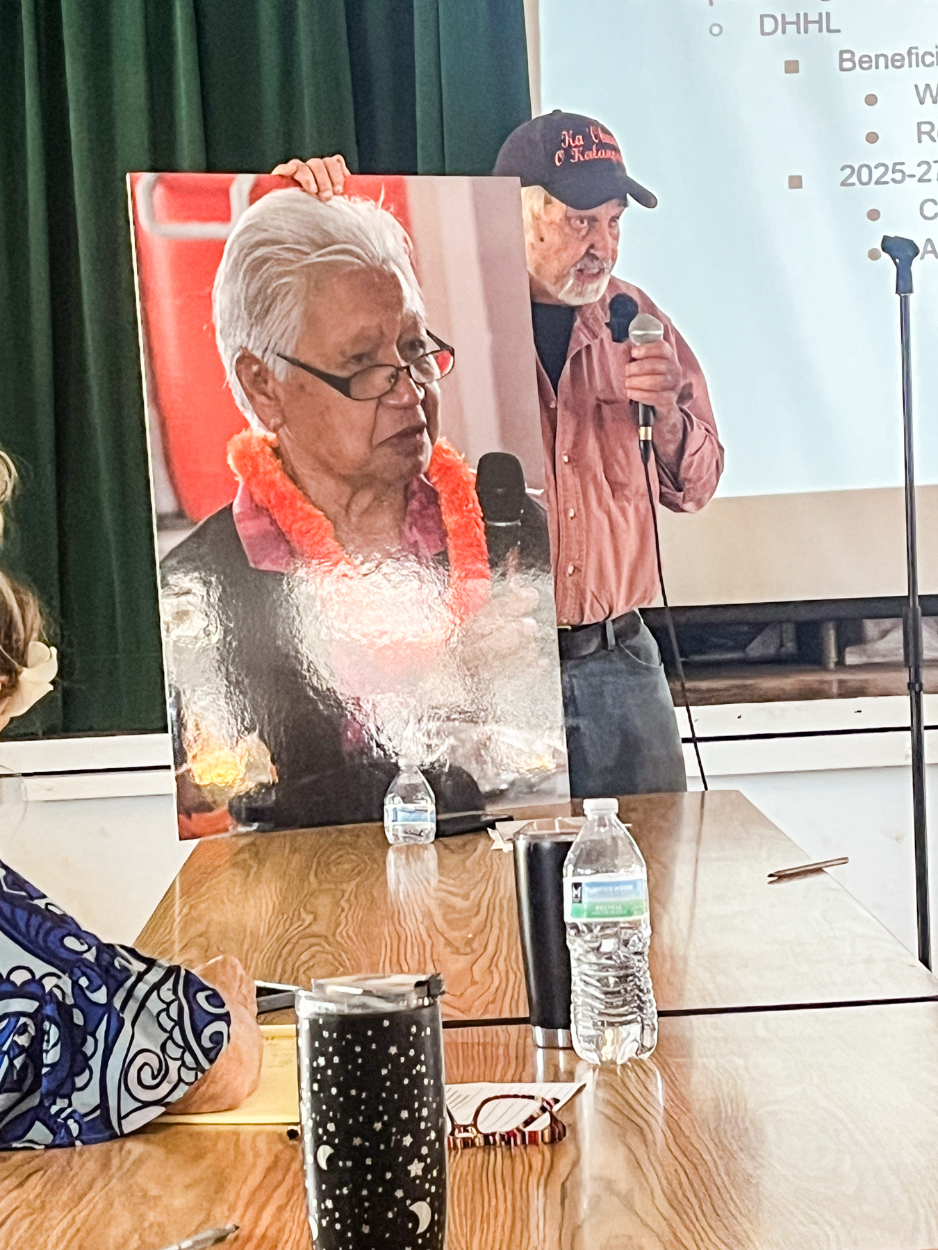 “This is Pauline Chow, a resident of Kalaupapa who recently passed away,” said DeGray Vanderbilt, a board member of Ka Ohana O Kalaupapa, which is a patient-formed organization dedicated to creating a monument for those sent to Kalaupapa. Vanderbilt held a large photo portrait of Chow, and lamented the lack of community input on the transition team.