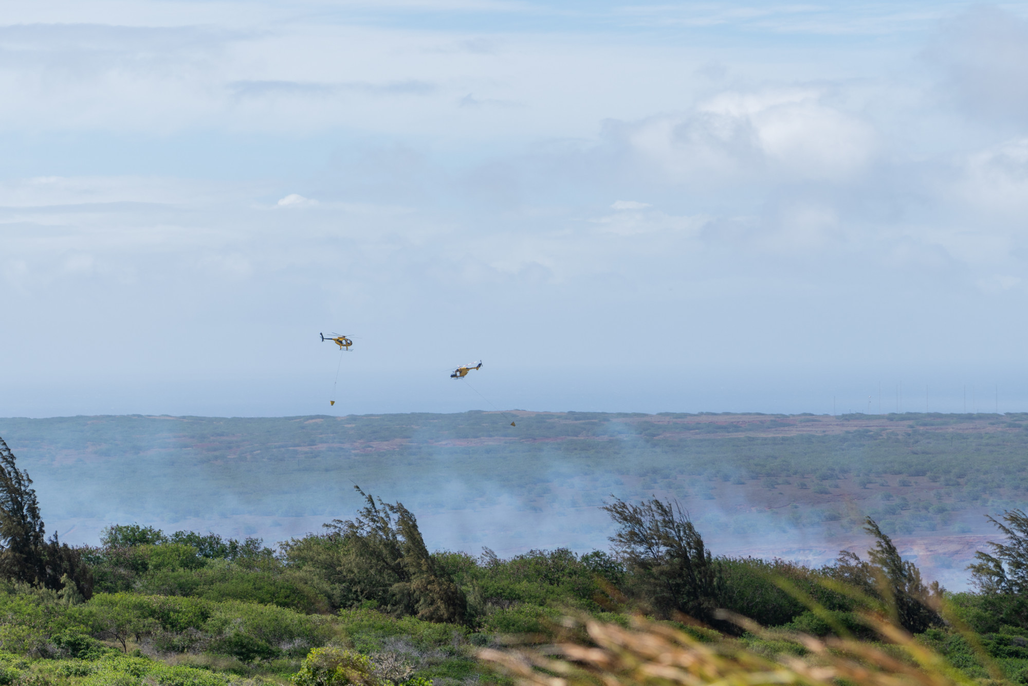 On June 20, around 1 p.m. Molokai fire crews arrived to find a brush fire partially in a gulch and being spread by the windy conditions in the area of 40 Maunaloa rd. Access to portions of the fire was difficult due to the steep terrain of the gulch, according to the Maui Fire Dept. Using tankers, heavy equipment and helicopters, fire crews were able to eventually contain the fire and stop it from crossing the highway. Public works heavy equipment were able to assist in cutting lines around the perimeter of the fire. By 7 p.m. on June 20, the estimated 50 acre fire was declared under control, but not fully extinguished. On the morning of June 21, a specialized wildland firefighting crew was airlifted into the area to assist with the work in more inaccessible areas, as helicopters continued to make water drops.