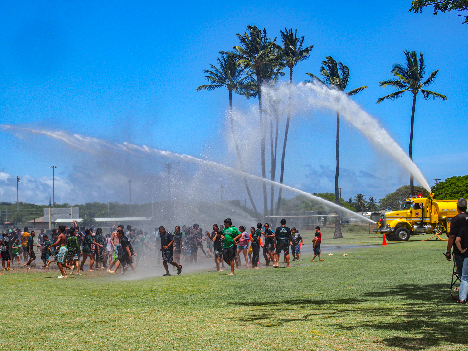 Kaunakakai Elementary School students celebrated the end of the school year in spectacular fashion. Firefighters from the Kaunakakai station brought a tanker and hoses to the last day of school on Thursday, May 30 to drench the enthusiastic kids, as per tradition.