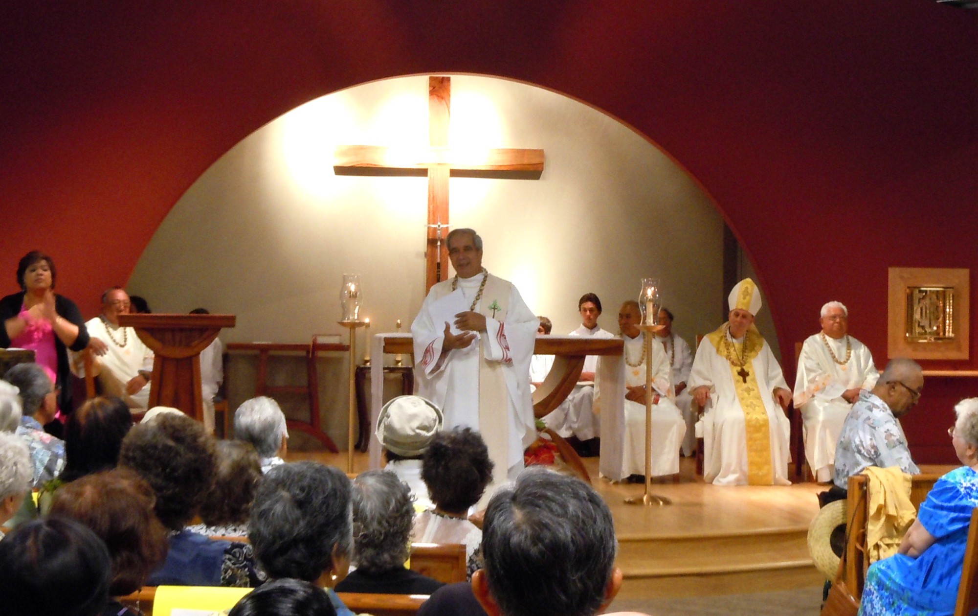 Father Clyde during the dedication Mass of the new St. Damien Church last year. Photo by Catherine Cluett