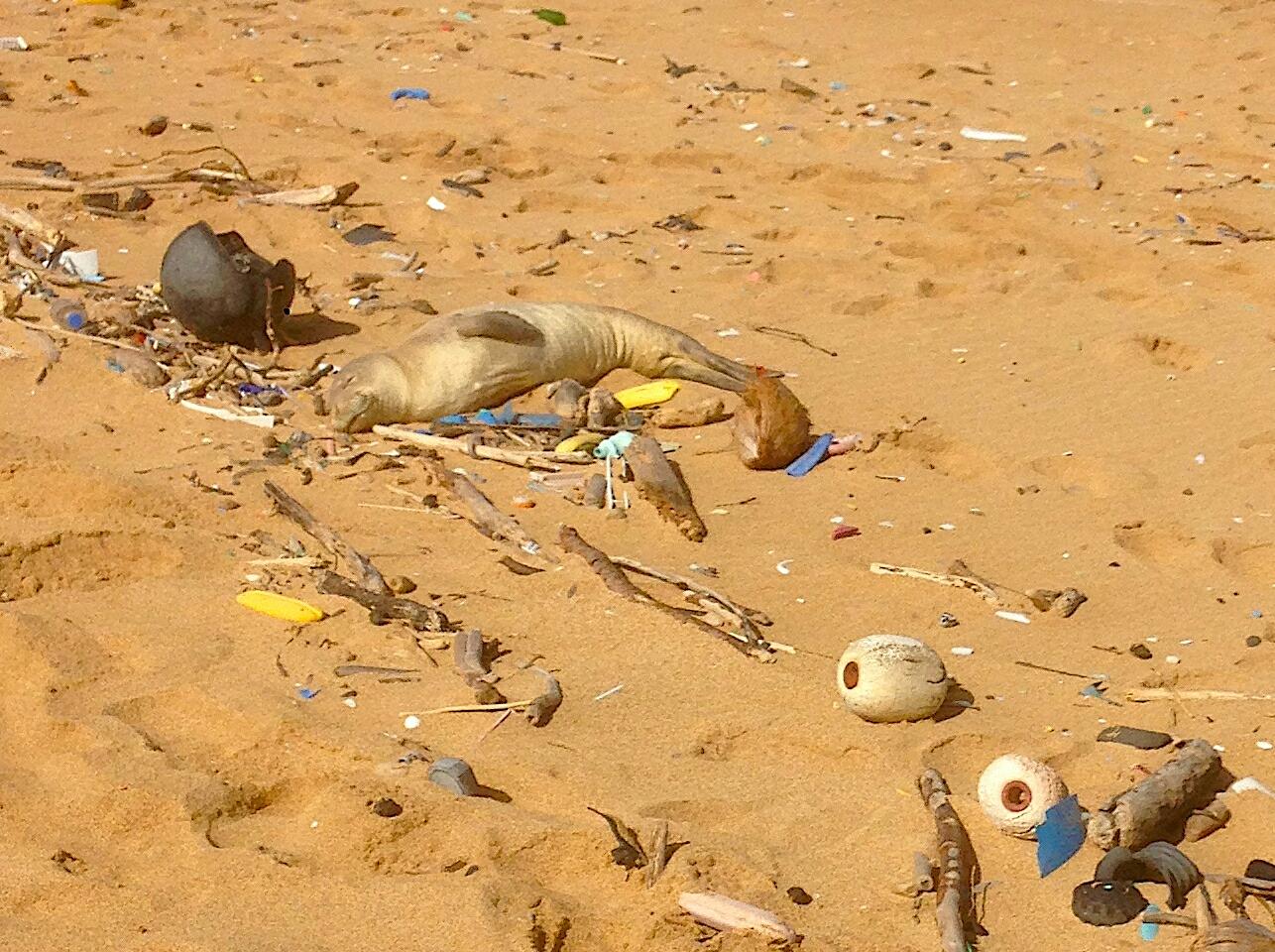 A Hawaiian monk seal sleeps amid rubbish washed up on Molokai’s northwest coastline recently; photo courtesy of Diane Pike