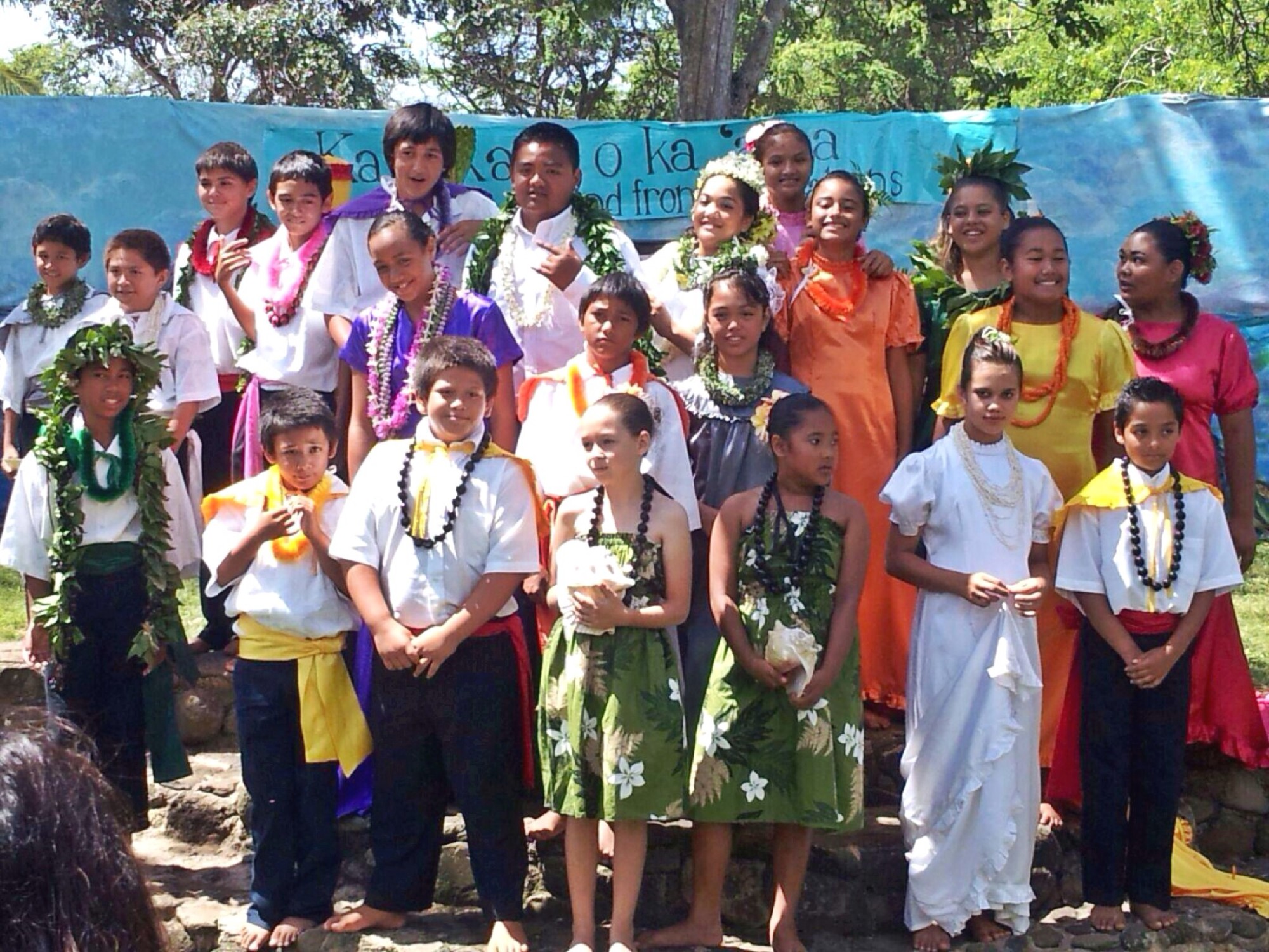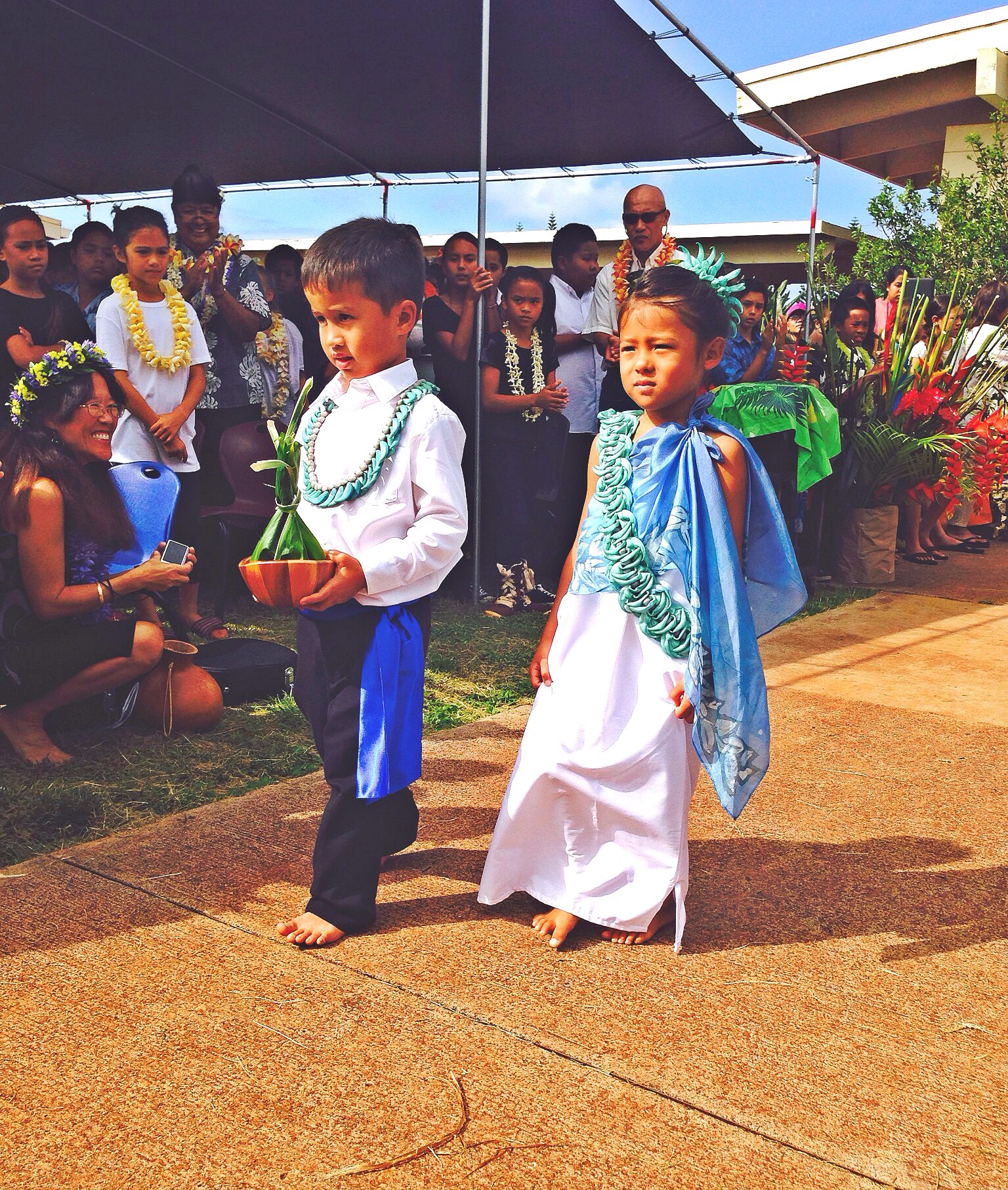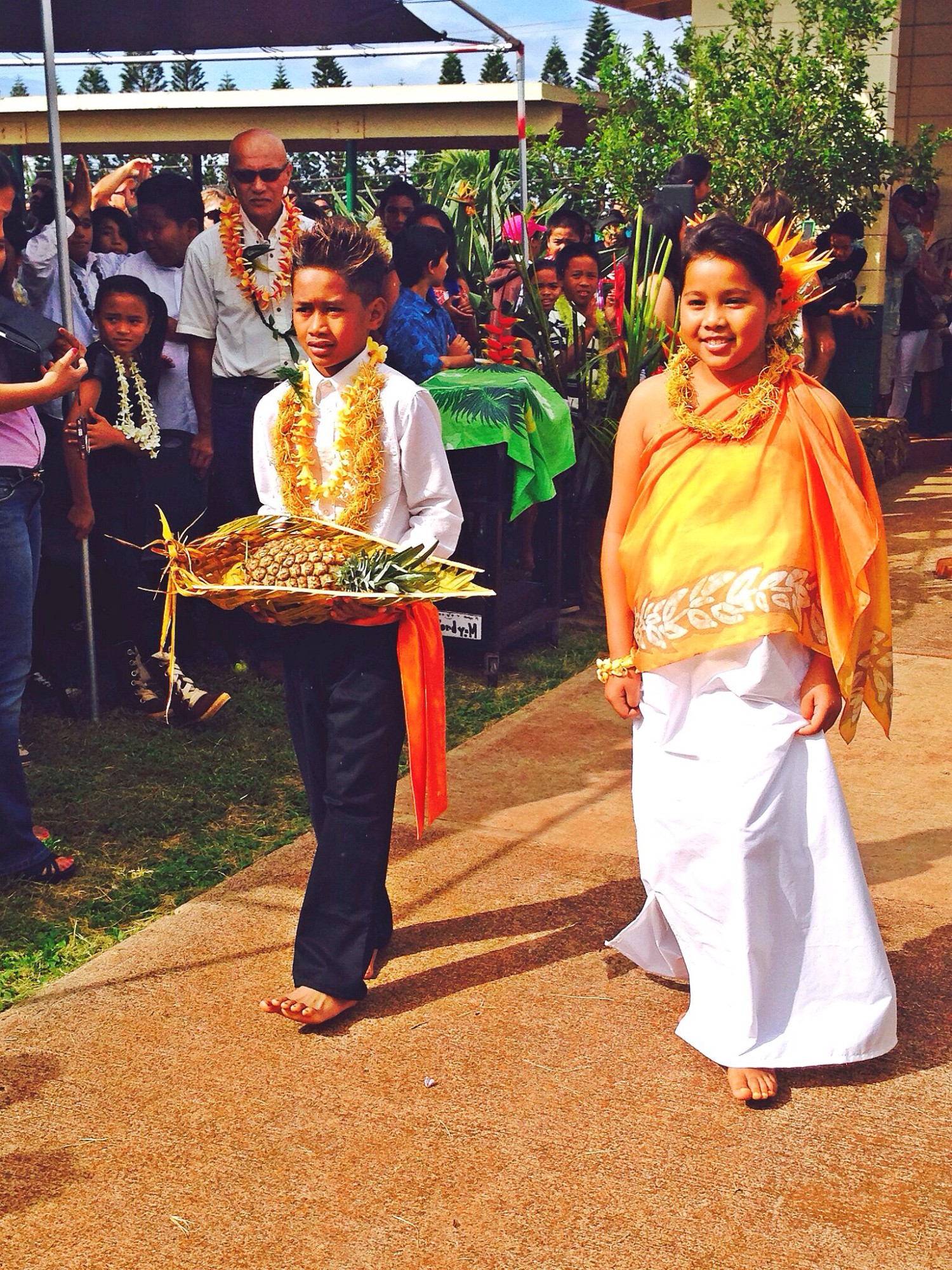 The keiki kane of Maunaloa’s court pose before the festivities begin. The school celebrated continuing to thrive with community support, even after the Department of Education proposed its shutdown several years ago. Photo by Catherine Cluett.