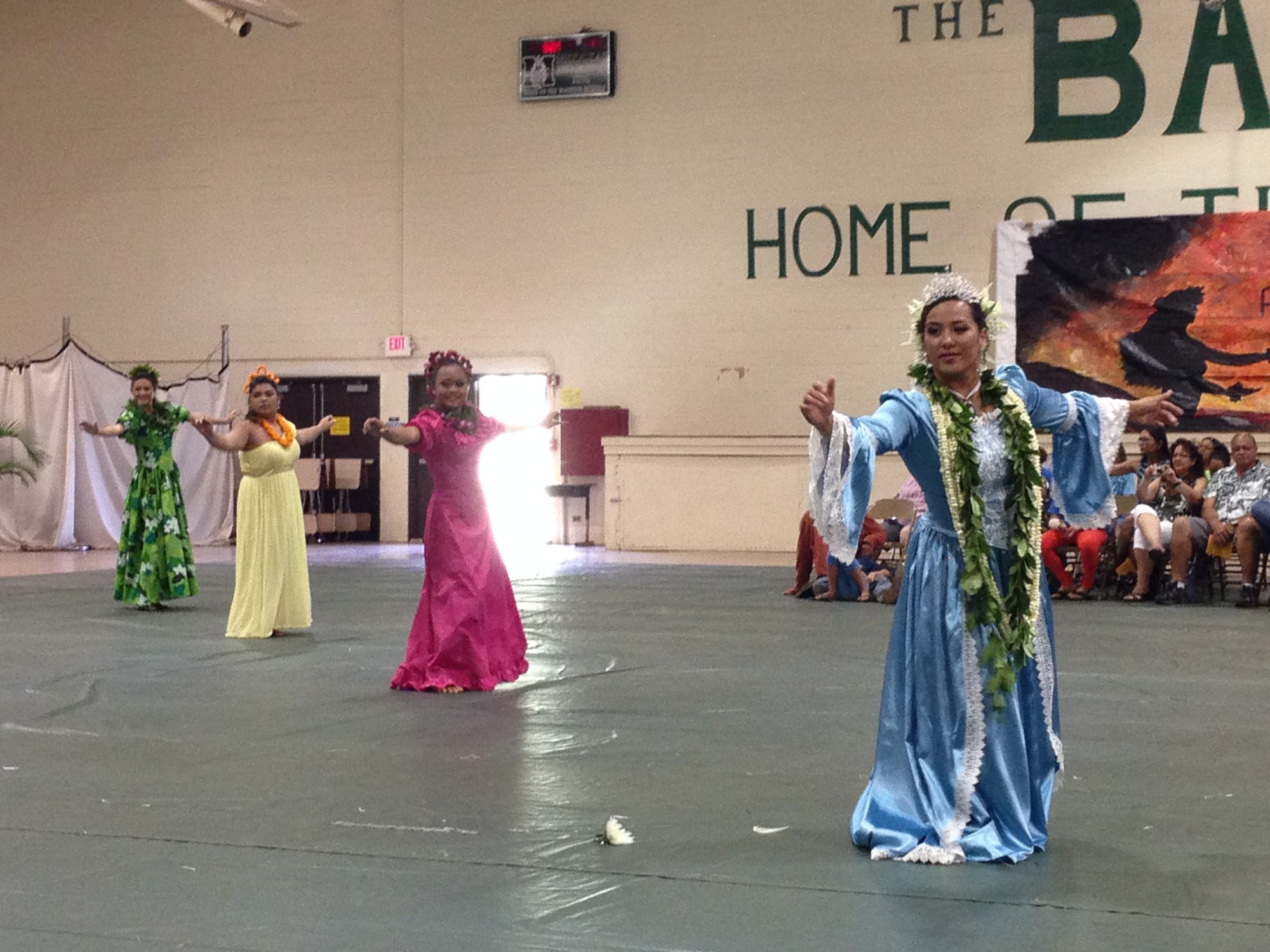 MHS’ royal court, led by Queen Lucy Wilhelm and King Robert Onofrio draped in blue, performed a joyful hula dance to “Kamehameha Trilogy” during the festivities. Photo by Bianca Moragne.