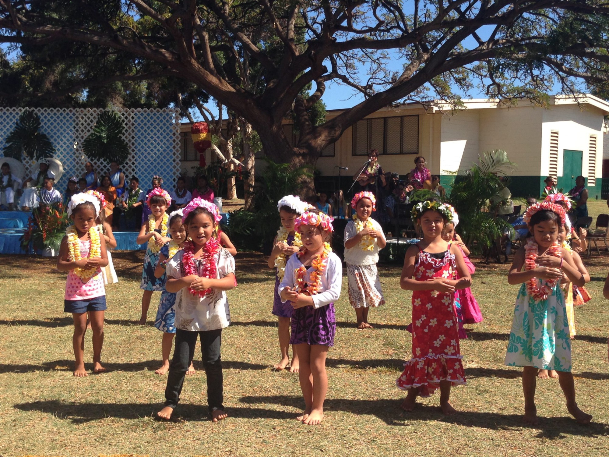 Kualapu`u School keiki hula danced in honor of Hawaii’s beloved chiefs during the May Day celebration, which featured live entertainment from Darren Benitez. Photo by Bianca Moragne