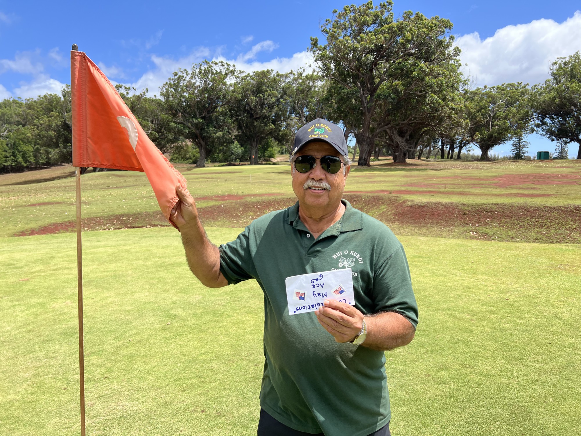 Zachary Helm is the May Ace winner for the Hui O Kukui Golf Club. Helm, a Molokai golf professional and Molokai musician extraordinaire, is now retired with 34 years of service with the County of Maui Parks and Recreations Department. Big Z shot 42-36 for a gross total of 80. With his 17 handicap, his 63 net got him the victory. Congratulations Big Z.