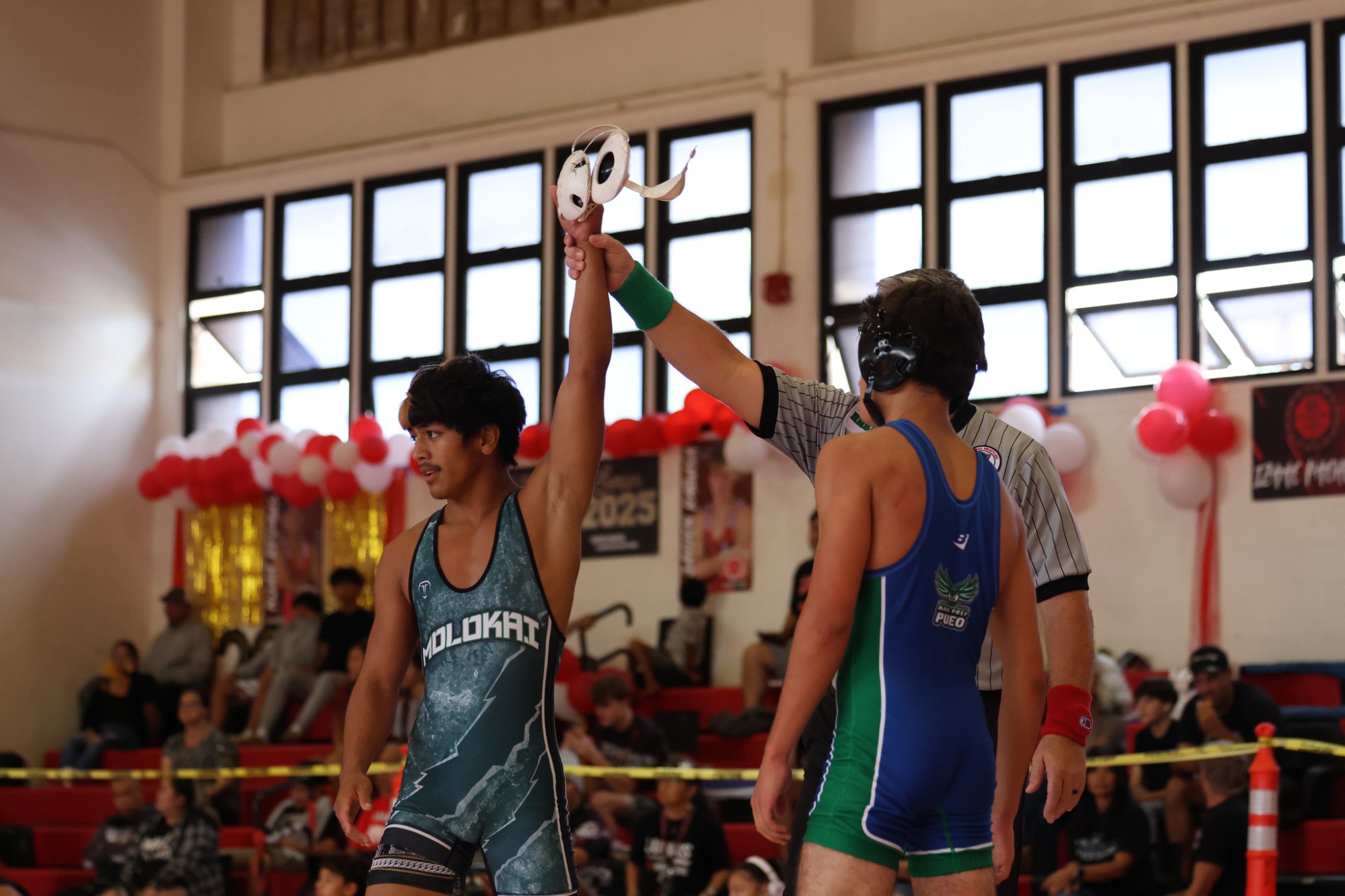 Despite last week’s storm, the Molokai High School (MHS) wrestling team was able to make the trip over to Lahainaluna for a round-robin tournament. The Farmers had a strong showing for both the girls and boys. For the girls, Hila’i Kapuni and Masina Borden-Phillips came aways with first place in their divisions, and Stephanie Gandeza and Jazlyn Boswell finished in second place.