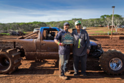 The races started at 8:30 a.m. and lasted until 4:30, with a few breaks for the vehicles to cool off before going back on the mud tracks. It had rained in Hoʻolehua during the week, and the light drizzle in the morning kept the tracks quite watery. “Eventually, it kind of thickened up as the day went by,” Hana Alcon said. In the afternoon, the winds picked up and the skies cleared quite a bit, creating a perfect playfield for the boggers.