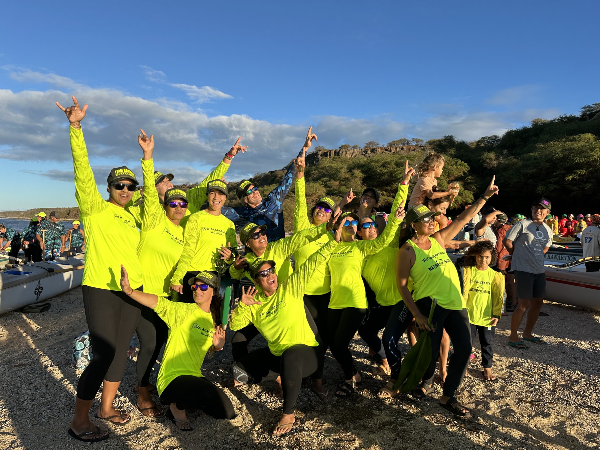The Molokai team of open division wahine – Pualei Lima, Kalei Adolpho, Courtney-Rhyan Turner, Honora Kalama, Nicole Schroeter, Lili’uokalani Kapuni, Sarajane Larkin, Kaala English, Sybil Lopez and Ishay Kaholoaa — left it all on the water during their top 20 finish. Erika Espaniola trained as alternate. Many of them are mothers and grandmothers, working full time jobs and juggling a slew of other commitments. They battled physical fatigue and mental exhaustion, navigated unpredictable ocean currents and relied on their rigorous training to carry them through.