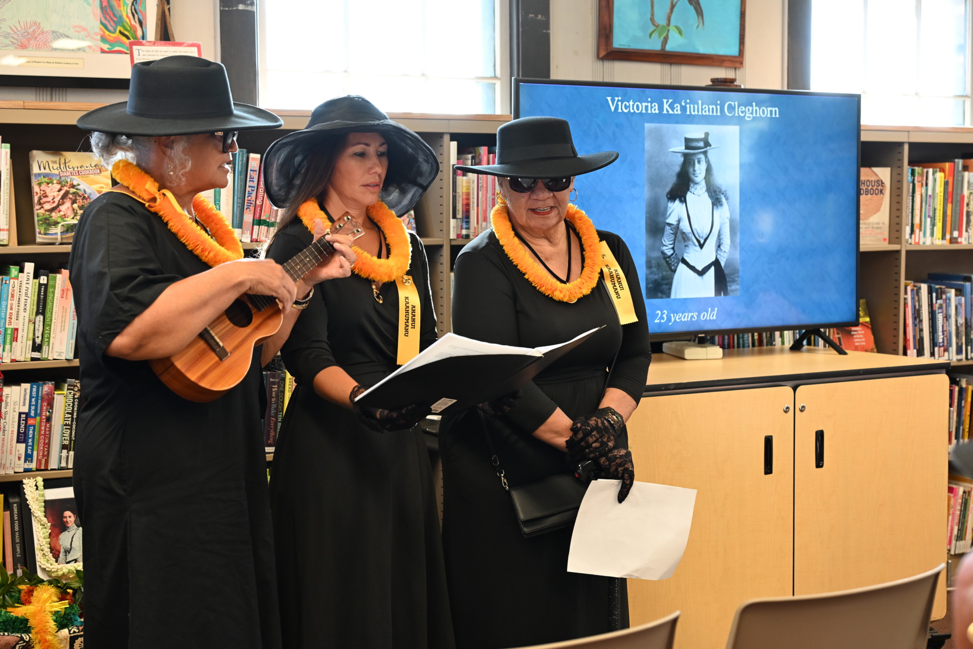 Members of the Ka’ahumanu Society, left to right, Kaui Kapuni Manera, Momi Makamae and Lesley Sambajon, sang at the E Ho’omana’o event at Molokai Library Oct. 28. Photo by Léo Azambuja