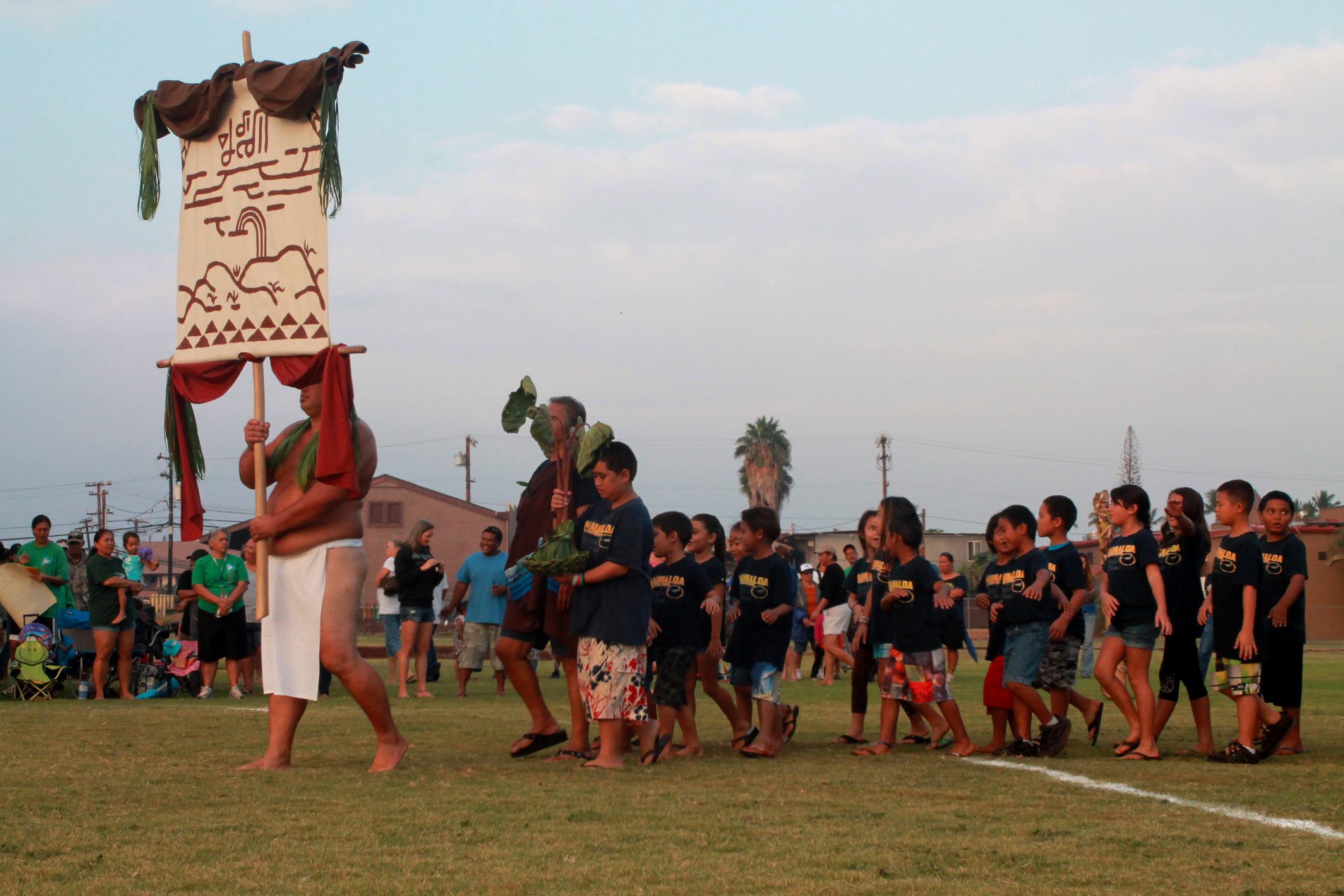 The students’ cultural awareness was evident as they filed into the stands during the opening ceremony. A kupuna led each district with a ho`okupu to Lono, god of agriculture and fertility. During Makahiki, the ancient Hawaiian season of peace, war was kapu, or forbidden, and every district gathered to celebrate the harvest and challenge each other’s athletic prowess.