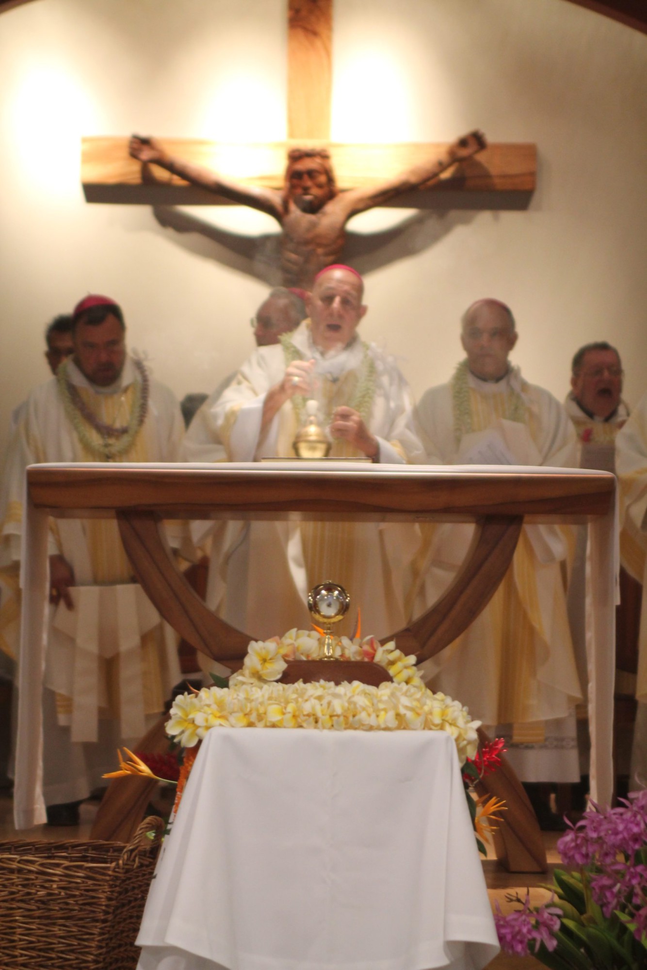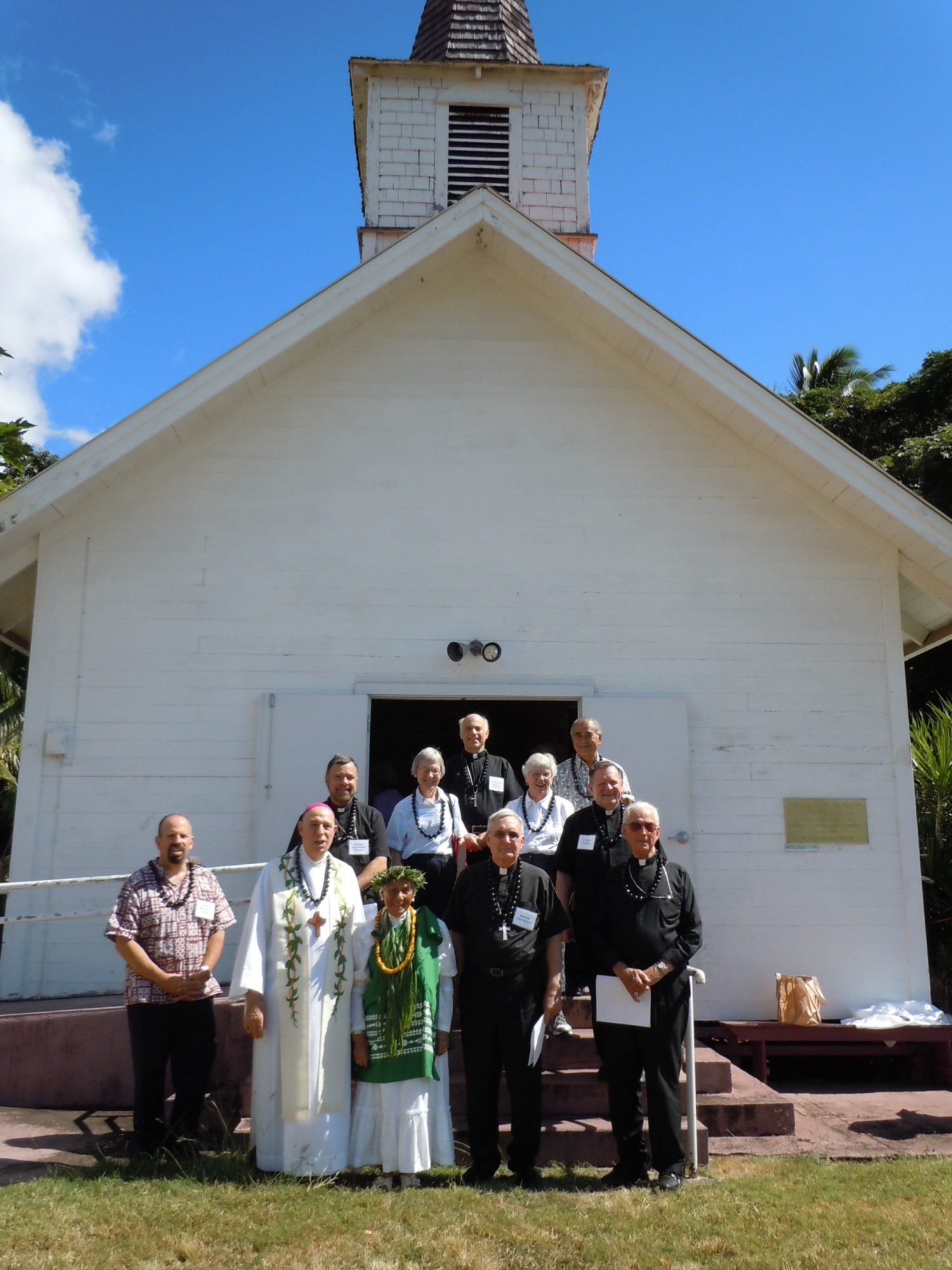 Saturday morning, four students from St. Francis High School on Oahu took turns carrying the relic down the pali trail to Kalaupapa, accompanied by several Franciscan sisters and Molokai residents. The youth were chosen out of about 500 students at the school based on essays they wrote. At the bottom of the trail, the group was met by the bishops, who flew into the settlement for the celebration.