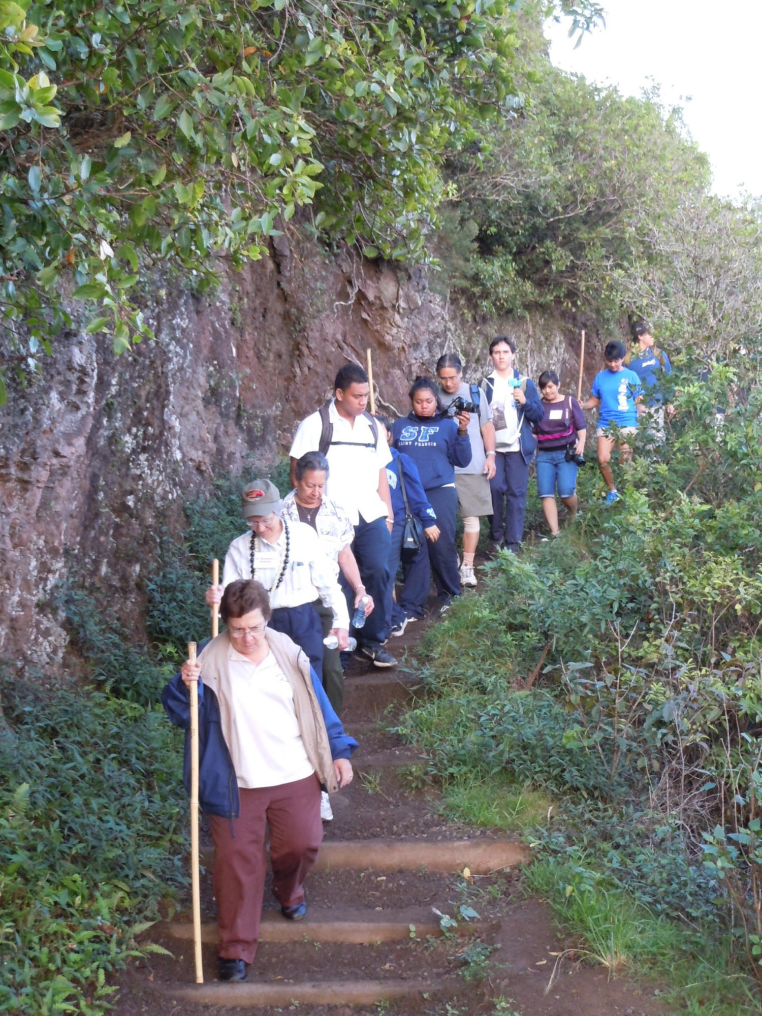 A group of Franciscan sisters, students from St. Francis High School on Oahu, and a few Molokai residents hiked with the relic down to Kalaupapa. Photo by Catherine Cluett