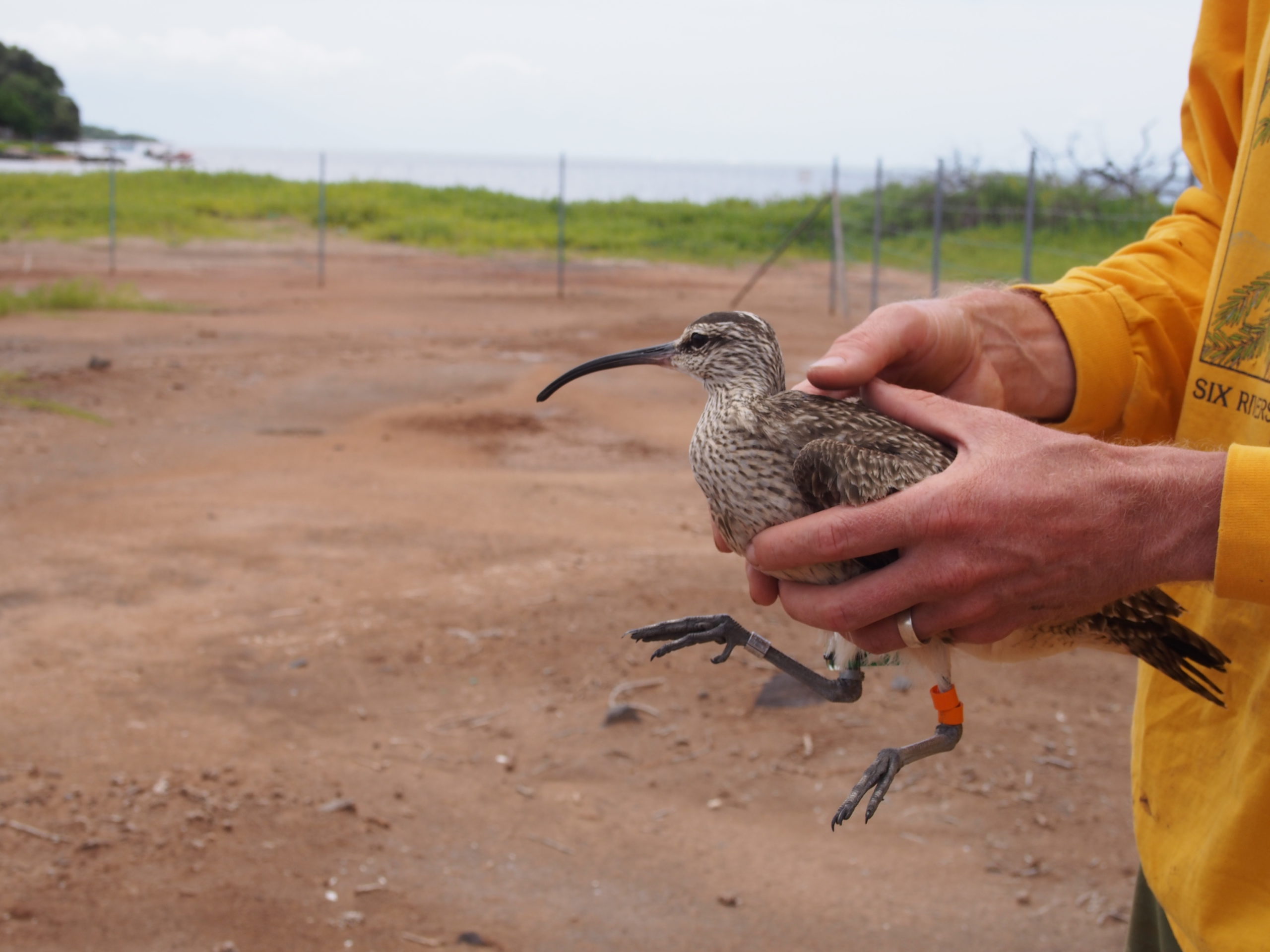 While five of the six kioea were bristle-thighed curlew, one was similar in appearance but a different species, called a whimbrel. These birds are very rare, according to the biologists, but this particular individual has been coming to Molokai for the past seven years, said Dibben-Young. She knows this because, even though the bird wasn’t tagged until now, the female followed the same behavioral patterns and locations each year.