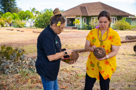 MoMISC coordinator Lori Bucanan, left, shows U.S. Sen. Jill Tokuda a coconut infected with mites at Kapu’āiwa. Photo by Marissa Motas