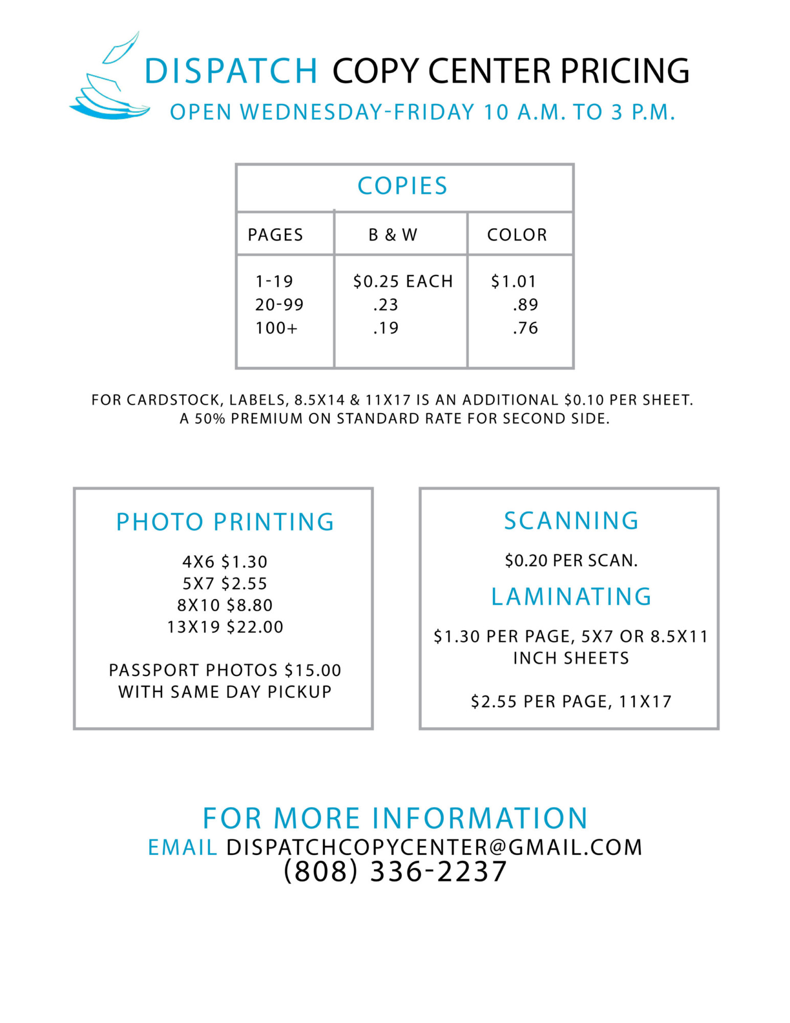 Include your name, how many copies of each document you would like, if it is black and white or color, and specify what type of paper you want it printed on (ex: cardstock, photo paper).