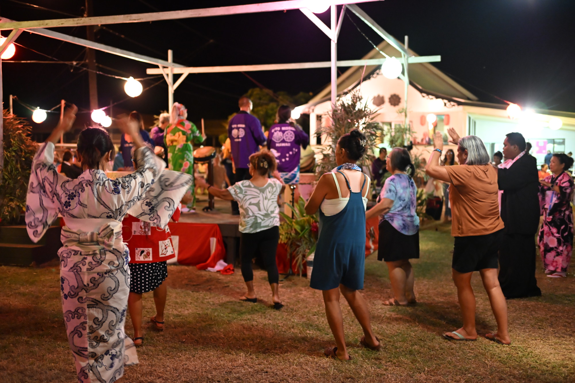 A group of dancers from Oahu also came to Molokai specifically for the occasion. The Waipahu Taiyoji Soto Mission Bon Dance Class, led by sensei Derrick Iwata, wore colorful traditional kimonos, mixing with Molokai residents during the dances.