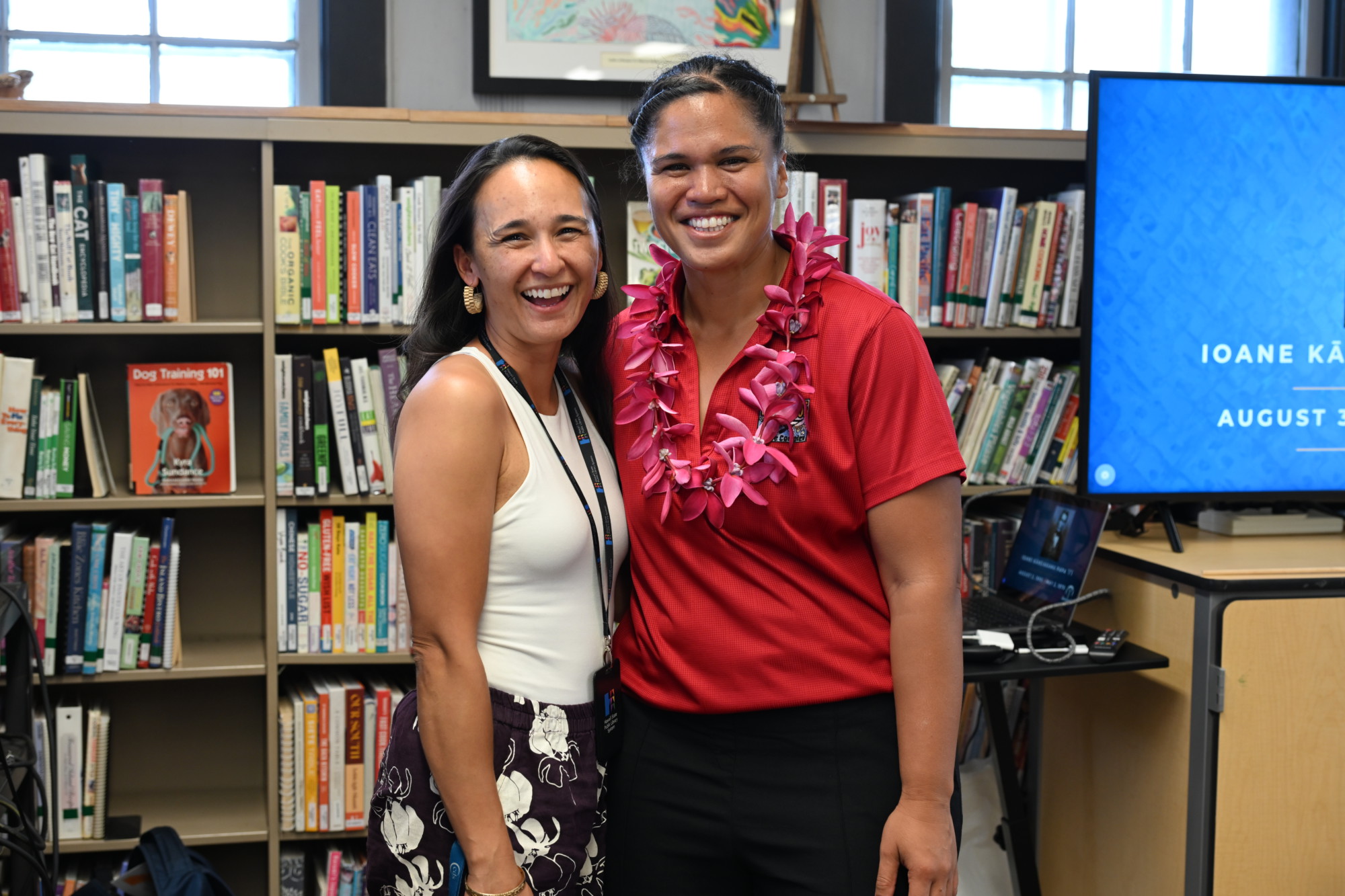 Molokai Public Library branch manager Mia Langer Ritte, left, with Awaiulu head researcher Kalei Roberts. Photo by Léo Azambuja