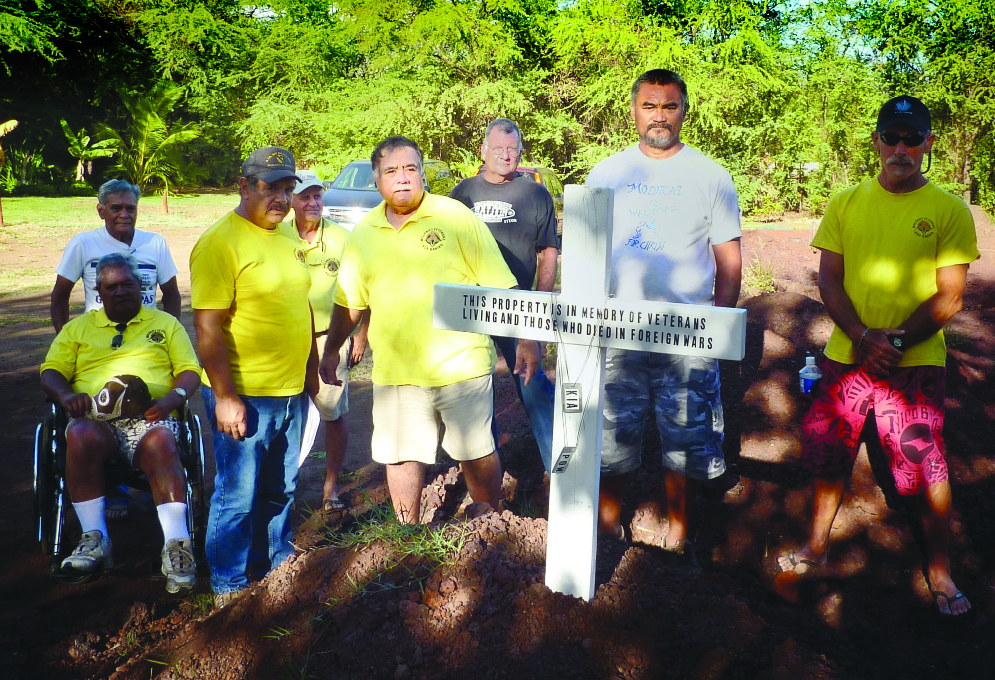 In this photo from May 2010, veterans gather around a cross erected on the ground of the then-future Veteran’s Center. The cross honored Molokai vets who died since the effort to build the center began in 2006. Photo by Catherine Cluett