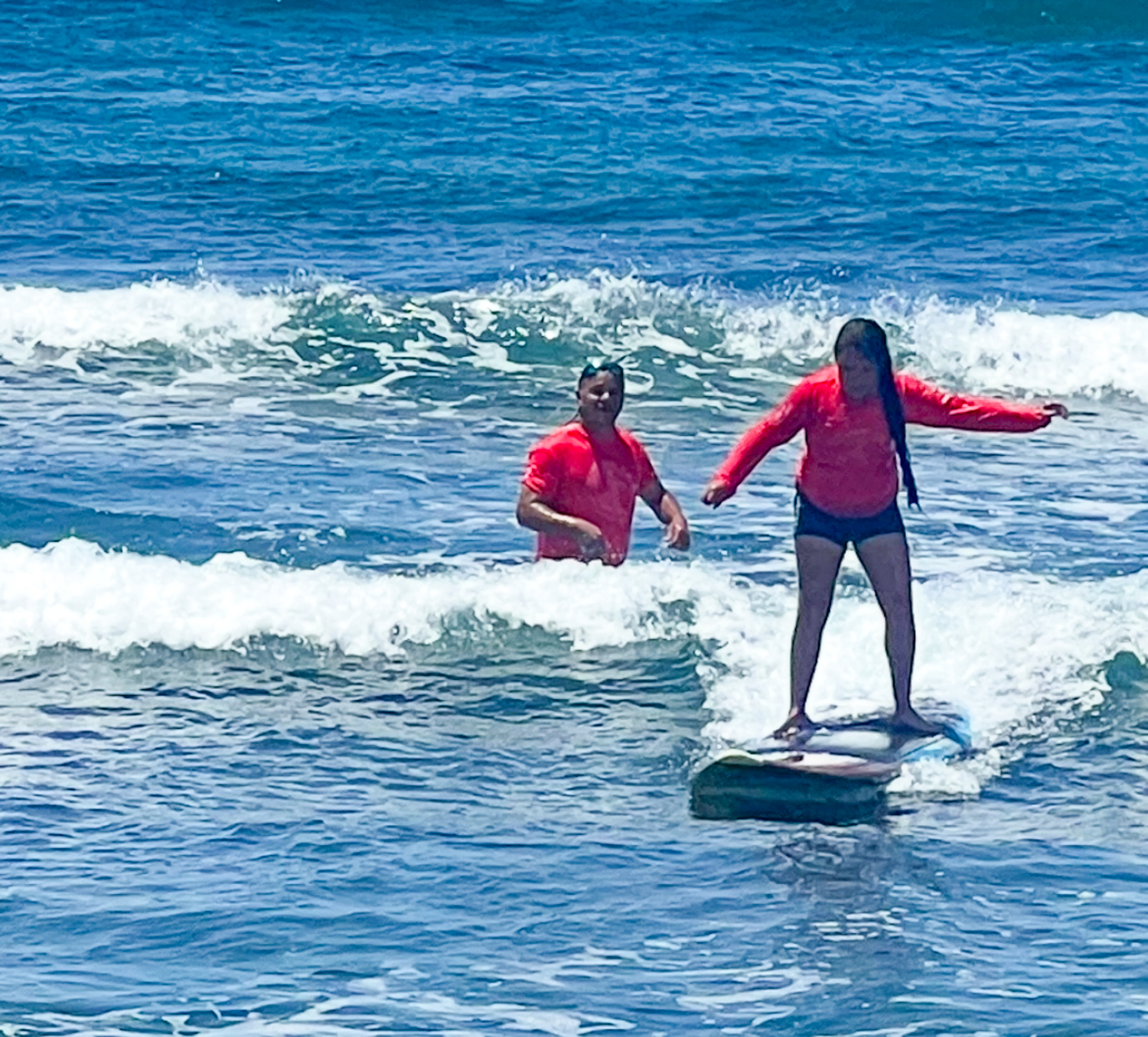 Dicky Stone watches as Aulani Waits catches a wave at the Molokai Keiki ‘O Ke Kai at Waialua Beach last Saturday. Photo by Malia Waits