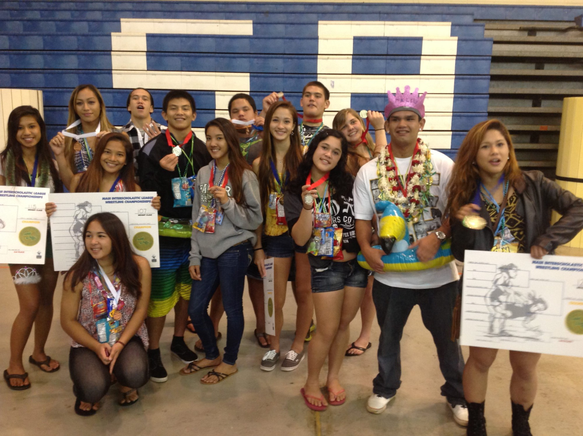 The Molokai High School wrestlers show off their awards at the 2013 MIL Championships.