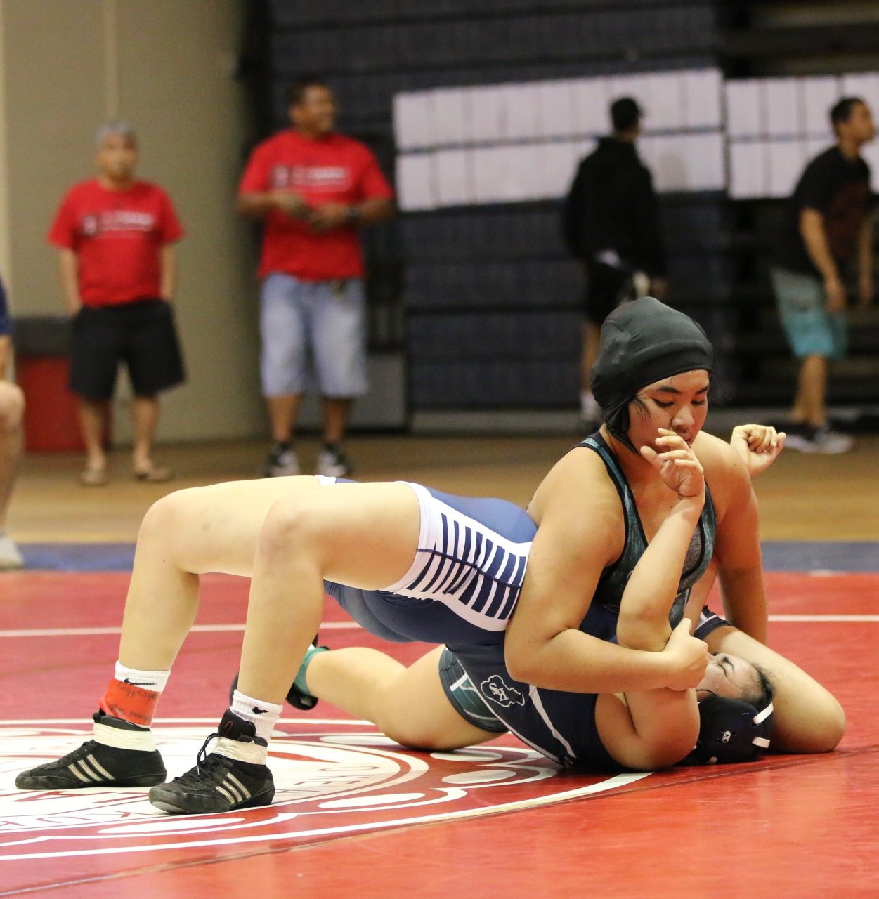 “Overall our guys and girls did well and some did better than anticipated,” he said. “Kamahina Kaiama-Kanuha (128 pounds) and Martika English (184) both beat opponents in the semi-final round that they had previously lost to. Caele Manley (154) and Diego DePonte (162) were our stand out first place winners for the boys and both secured nail biting one point victories over their opponents in the finals. Ale`a Davis (99) and Daisha Kahoalii-Kalilikane (140) finished first place for our girls. We are excited about moving these nine on to the state tournament and will be working hard over the next week and half in preparation for the final battle.”